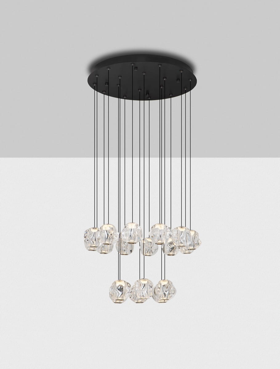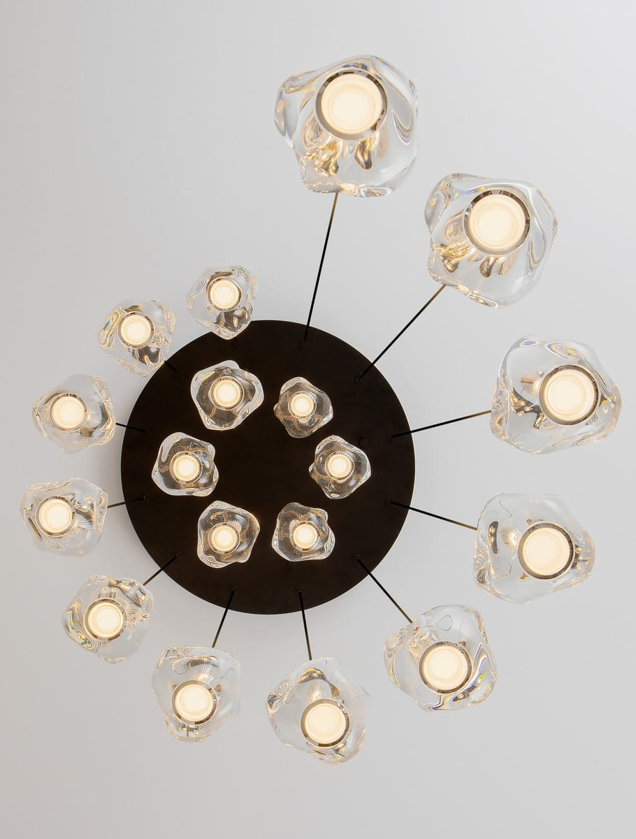 Kompozycja lampy składa się z osiemnastu kloszy wykonanych z transparentnego akrylu, które zostały rozmieszczone na różnych wysokościach, tworząc efekt przestrzennej kaskady. Akrylowe klosze przypominają organiczne, nieregularne formy, które swoim kształtem nawiązują do płynnych ruchów szkła. Każdy klosz swobodnie zwisa z okrągłej, metalowej podsufitki, co nadaje lampie lekkości i dynamicznego charakteru.