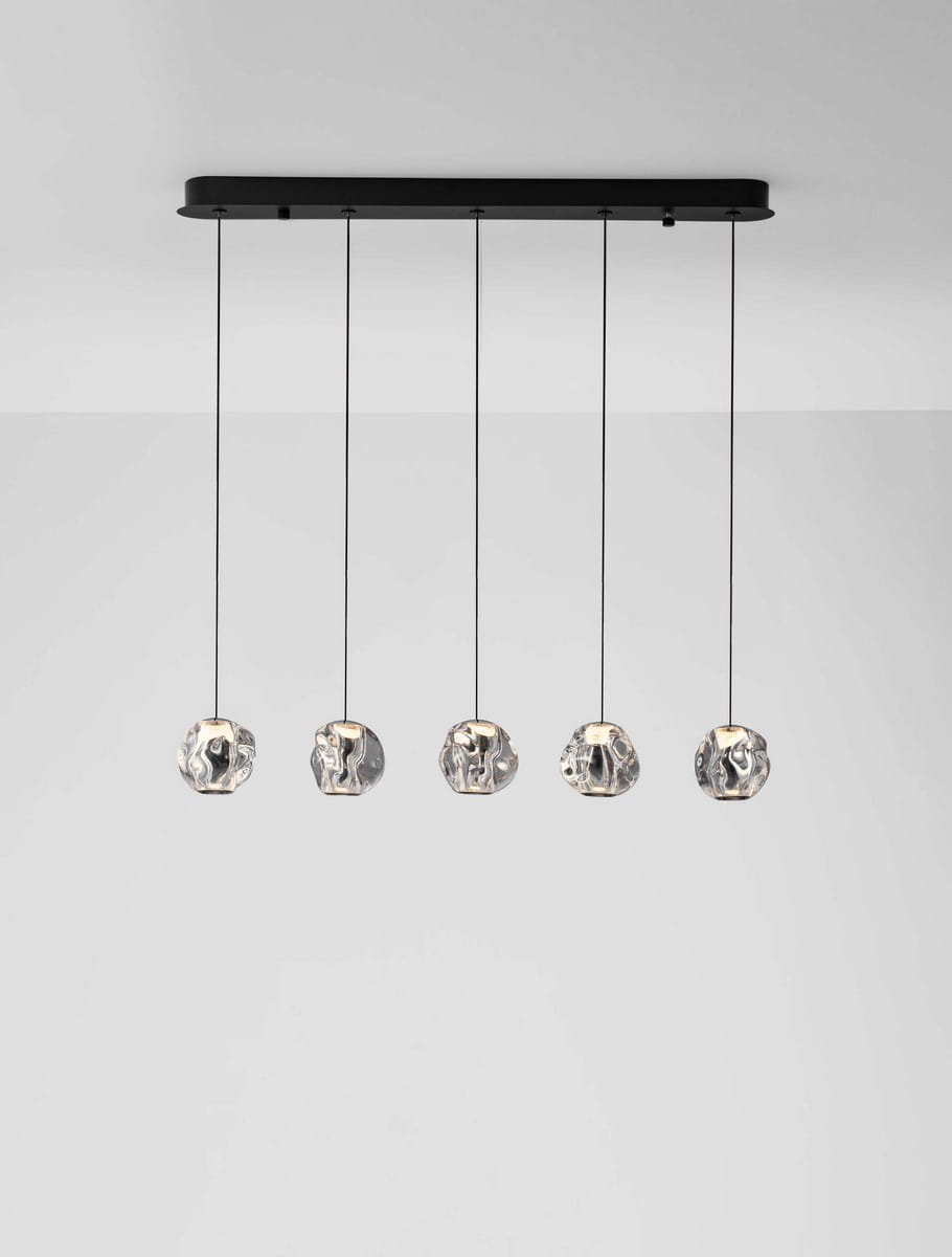 Podłużna podsufitka w subtelnym, nowoczesnym wykończeniu stanowi solidną bazę dla kompozycji, a liniowe zawieszenie kloszy tworzy harmonijną kompozycje, który przyciąga wzrok. Rozmieszczenie kloszy zapewnia równomierne rozproszenie światła, podkreślając nieregularne formy akrylowych elementów i tworząc zachwycające refleksy na powierzchniach wokół.