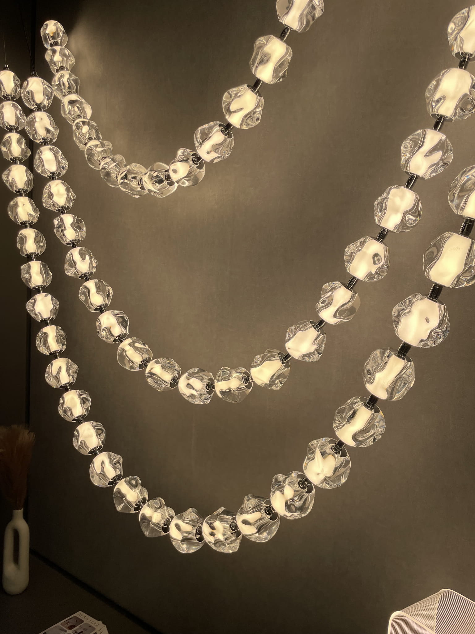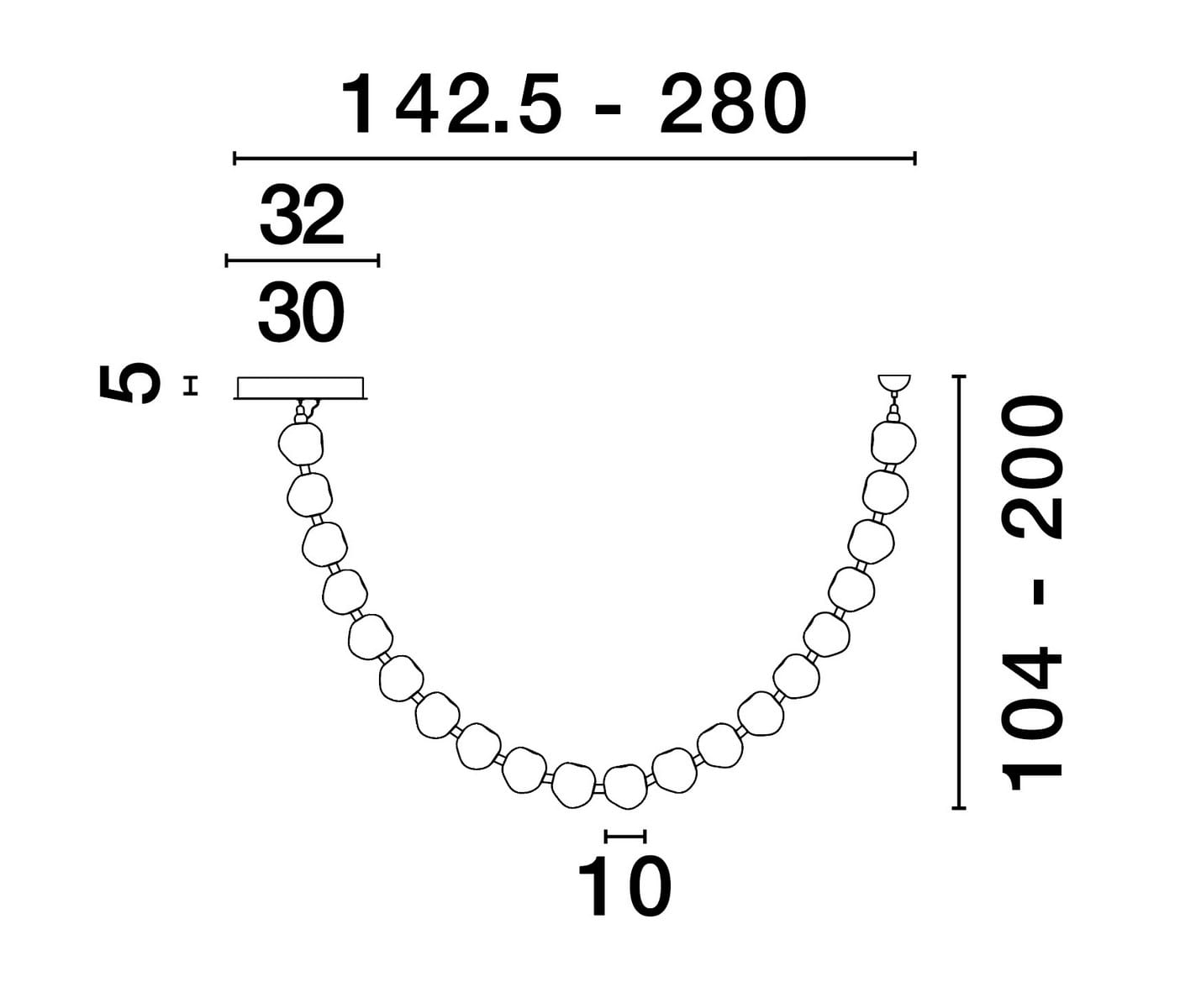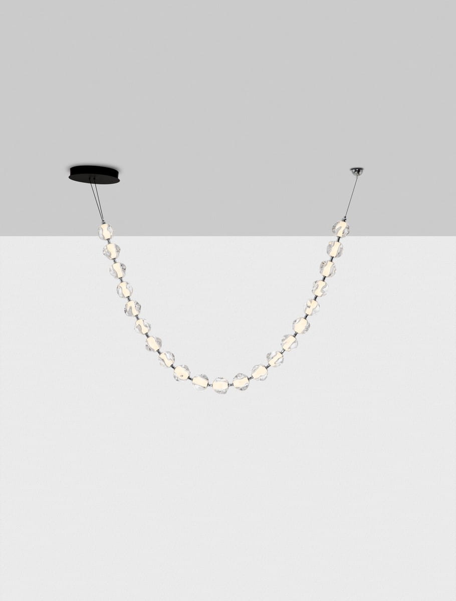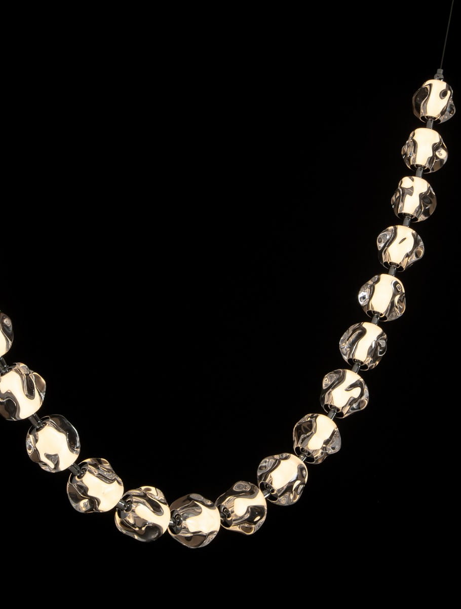 Lampa wisząca Chepen to wyjątkowy przykład nowoczesnego designu, który łączy w sobie artystyczną formę i funkcjonalność. Charakteryzuje się unikalną konstrukcją przypominającą świetlistą girlandę, utworzoną z rzędu transparentnych, akrylowych kloszy o nieregularnych kształtach. Klosze zostały zawieszone na delikatnych, ale wytrzymałych przewodach, tworząc harmonijną łukowatą kompozycję, która zachwyca lekkością i elegancją.