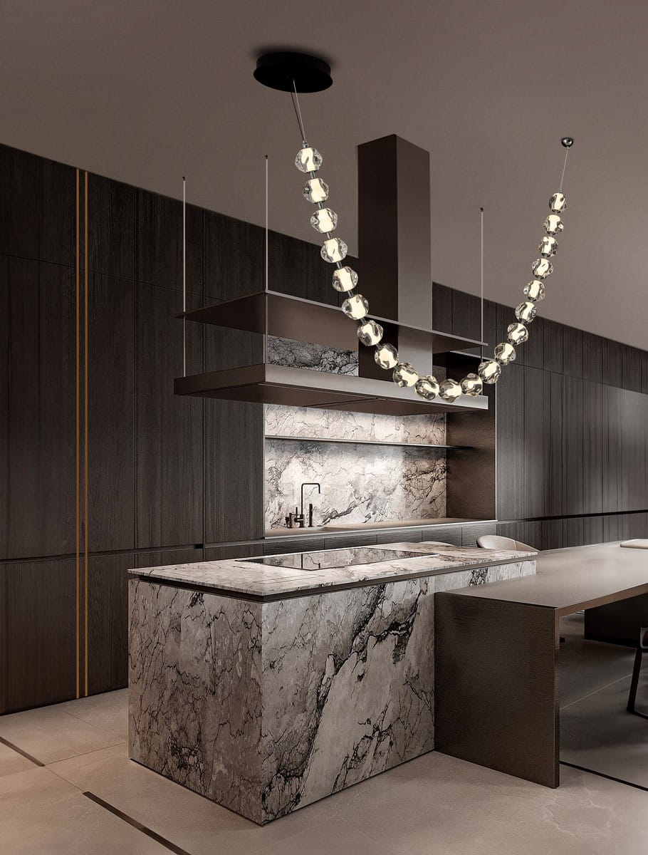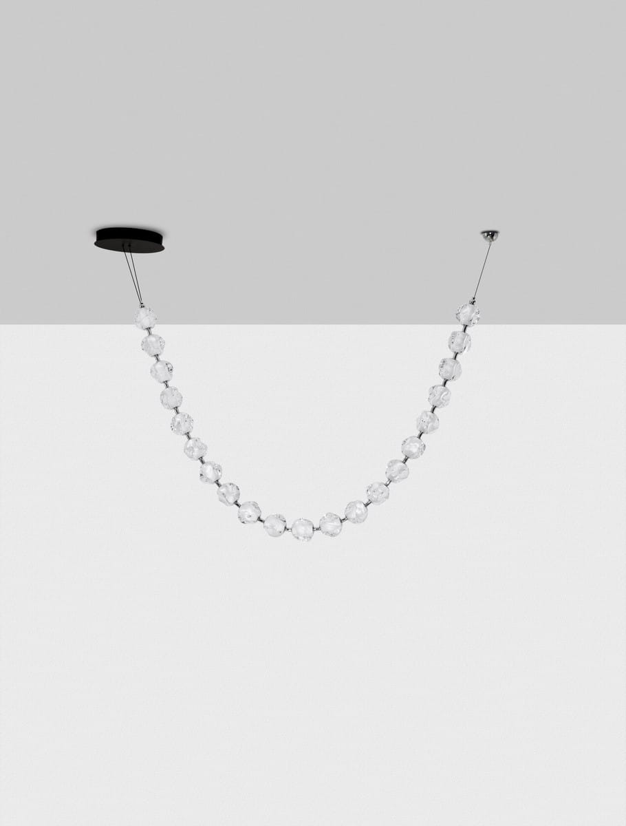 Metalowe elementy w matowym wykończeniu, w tym minimalistyczne podsufitki, podkreślają nowoczesny charakter lampy i doskonale kontrastują z przejrzystymi akrylowymi kloszami. Klosze wykonane z transparentnego akrylu charakteryzują się nieregularnymi, organicznymi kształtami, które przypominają płynne formy szkła. Ich tekstura tworzy unikalny efekt świetlny, rozpraszając światło i nadając wnętrzu przytulnego, a zarazem nowoczesnego charakteru.