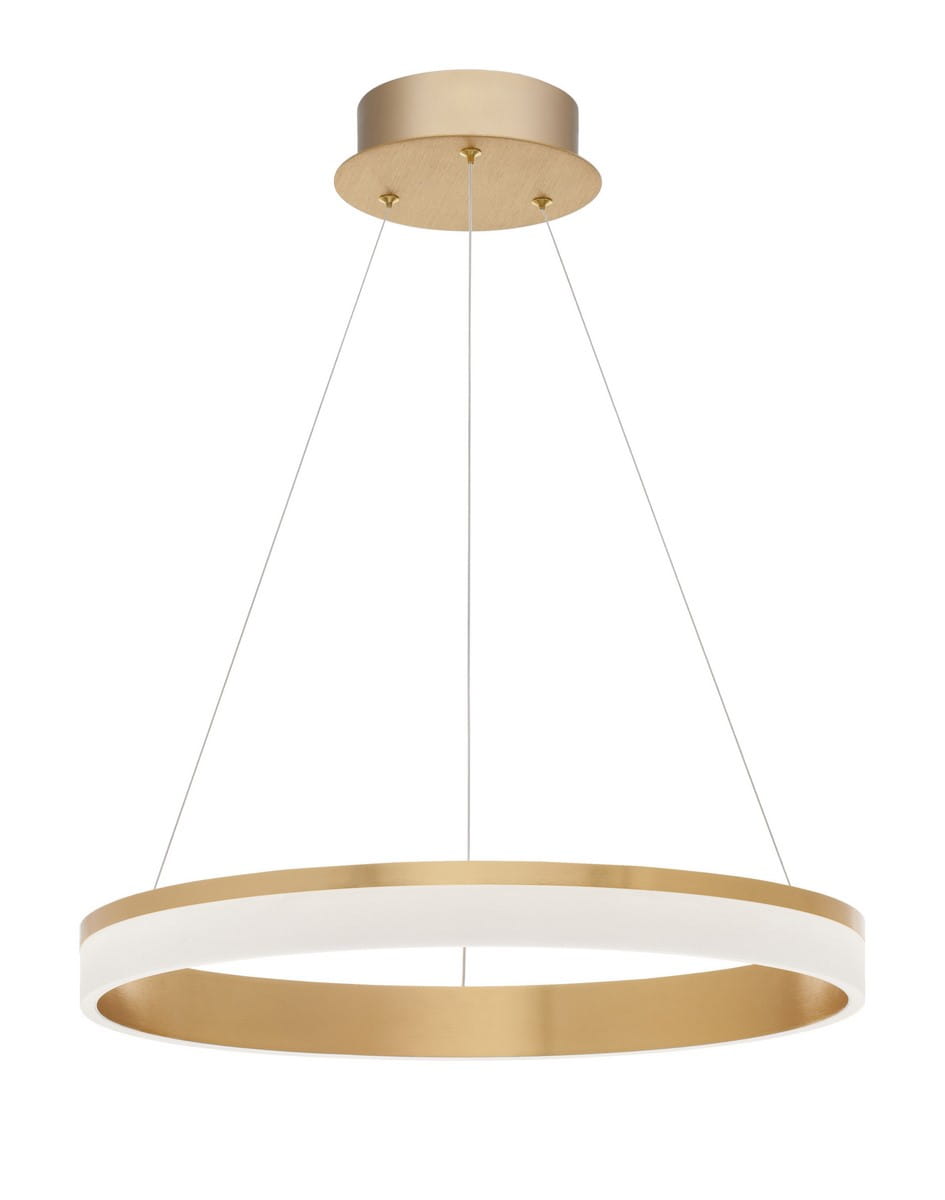 Złota konstrukcja nadaje lampie luksusowego charakteru, idealnie komponując się z białym elementem klosza oraz okrągłą podsufitką o tym samym, złotym wykończeniu. Całość konstrukcji delikatnie zawieszona jest na trzech subtelnych linkach.