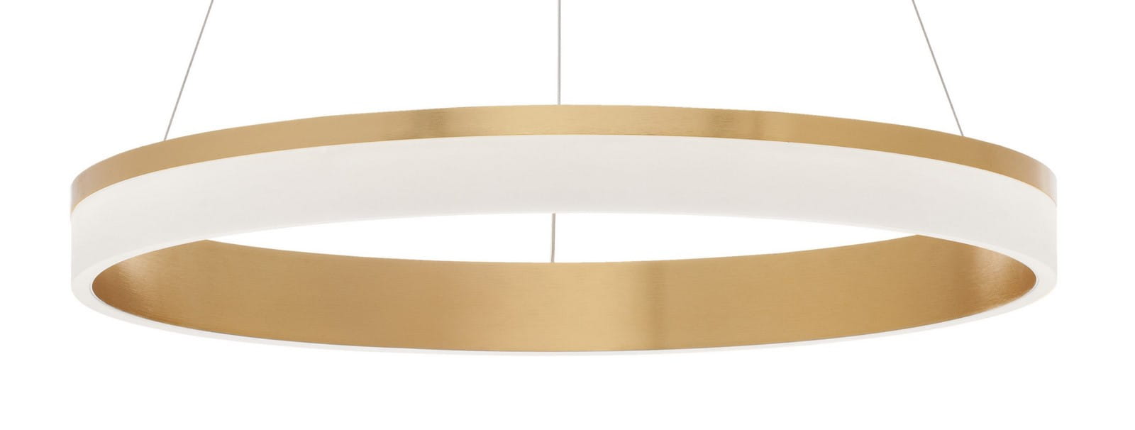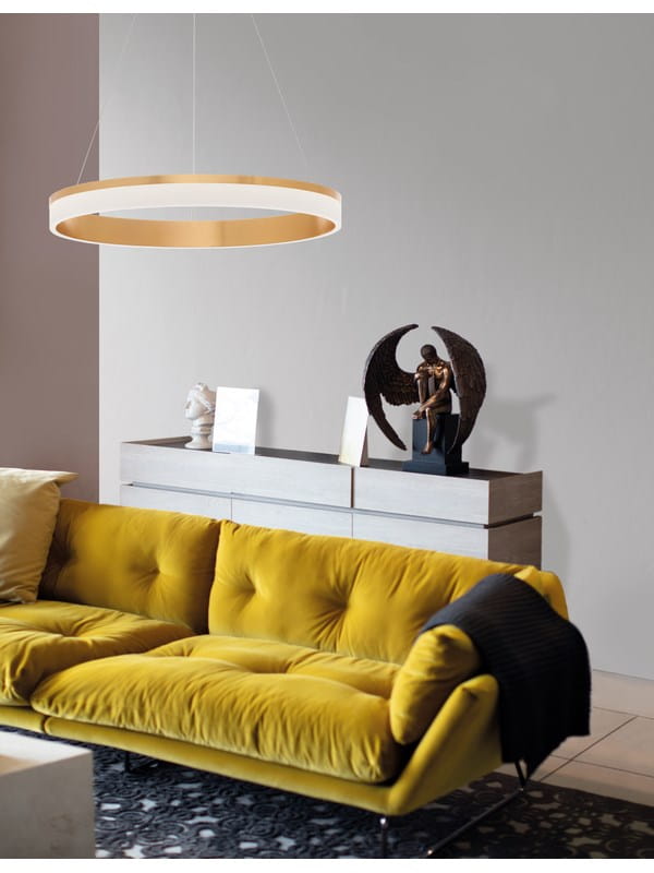 Zewnętrzna powierzchnia klosza powstała przez połączenie złotego aluminium z mlecznobiałym akrylem, tworząc dwukolory ring, ktory skrywa źrodło światła LED.