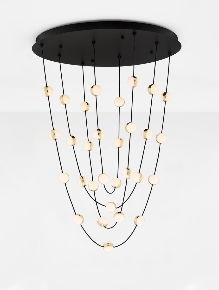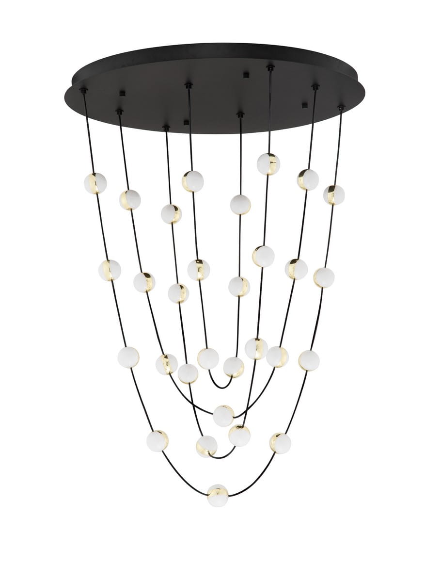 Akrylowe, delikatnie mleczne kulki, połączone z subtelnymi złotymi akcentami, zawieszone są na cienkich, czarnych przewodach, które nadają lampie dynamicznej lekkości. Konstrukcja przypomina spadające krople deszczu lub migoczące gwiazdy, tworząc wrażenie ruchu i subtelnego blasku.