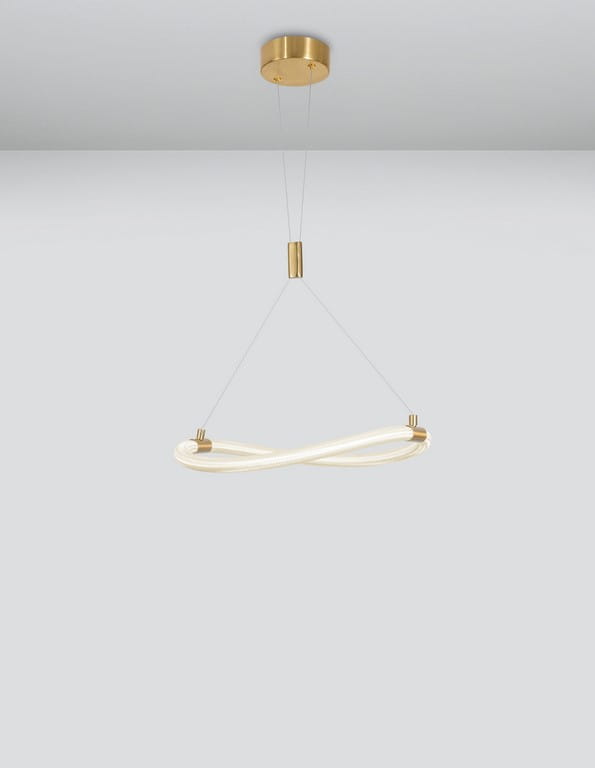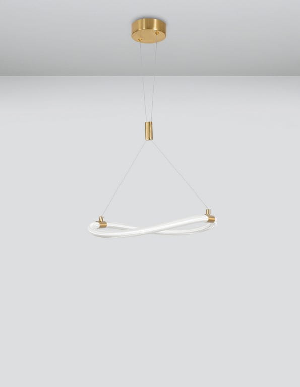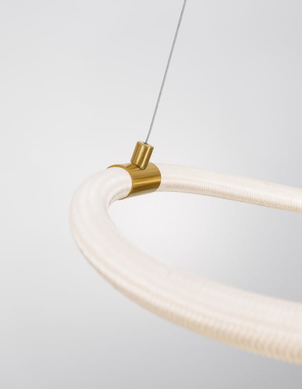 Złote detale wykonane z metalu nadają lampie luksusowego charakteru, idealnie komponując się z białym kolorem klosza oraz okrągłą podsufitką o tym samym, złotym wykończeniu. Całość konstrukcji delikatnie zawieszona jest na dwóch subtelnych linkach, które na środku wysokości łączy złoty pierścień, dodając całości wyrafinowanego charakteru.