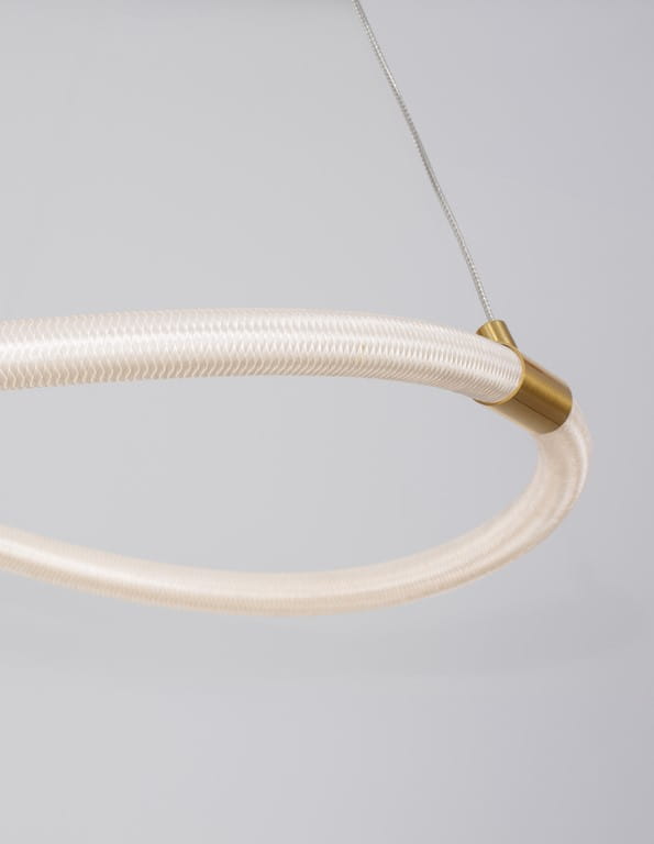 Klosz lampy w kształcie ringu wykonany jest z wysokiej jakości silikonu i przyciąga uwagę swoją pofalowaną linią. Wewnątrz klosza ukryte jest energooszczędne źródło światła LED, które subtelnie rozświetla przestrzeń.