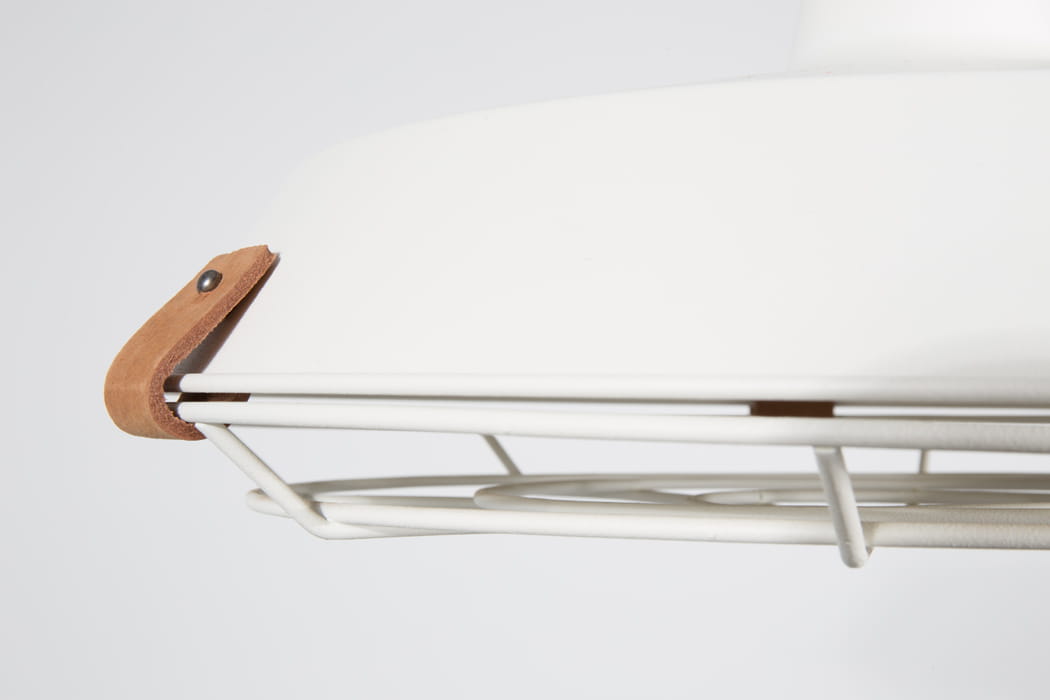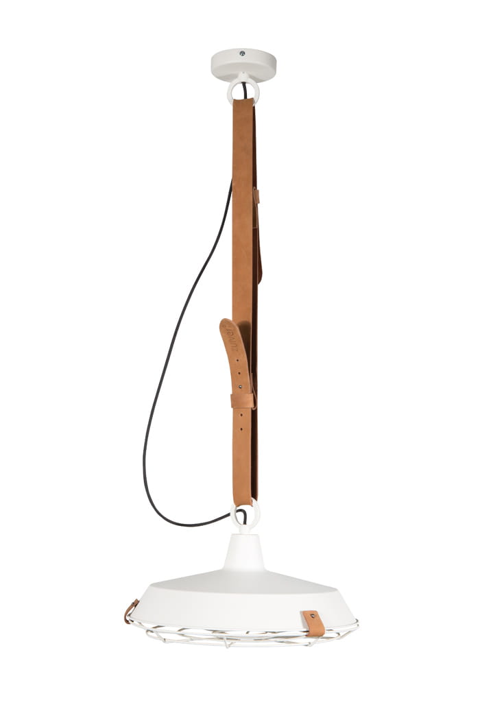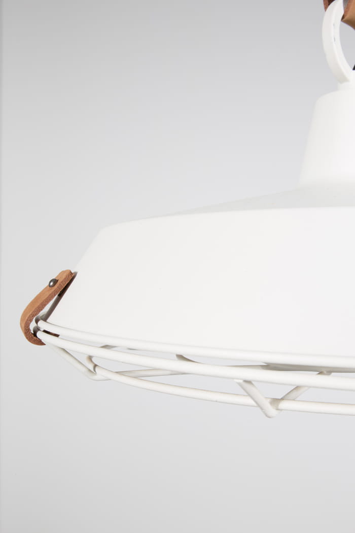 Obszerny klosz wykonany ze szczotkowanego metalu, zawieszony został na brązowym, grubym pasie z prawdziwej skóry naturalnej. Jest to element, który bez wątpienia jak pierwszy skupia uwagę. Podobnie jak w klasycznym pasku, wysokość lampy można regulować za pomocą metalowej klamry, idealnie dostosowując lampę do swoich potrzeb. Spód klosza od dołu wykończony został drucianym okratowaniem, przypiętym do głównej części za pomocą skórzanych, krótkich rzemieni. Tego typu wykończenie jest kwintesencją loftowego stylu, stawiającego na prostotę i srogość. Lampa posiada jedno źródło światła E27 na żarówkę 60W.