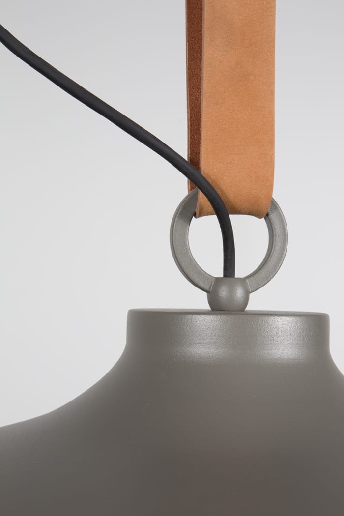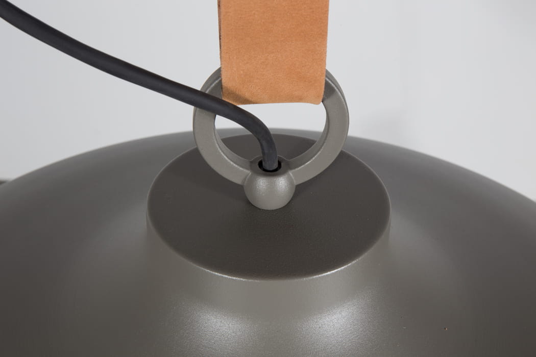 Obszerny klosz wykonany ze szczotkowanego metalu, zawieszony został na brązowym, grubym pasie z prawdziwej skóry naturalnej. Jest to element, który bez wątpienia jak pierwszy skupia uwagę. Podobnie jak w klasycznym pasku, wysokość lampy można regulować za pomocą metalowej klamry, idealnie dostosowując lampę do swoich potrzeb. Spód klosza od dołu wykończony został drucianym okratowaniem, przypiętym do głównej części za pomocą skórzanych, krótkich rzemieni. Tego typu wykończenie jest kwintesencją loftowego stylu, stawiającego na prostotę i srogość. Lampa posiada jedno źródło światła E27 na żarówkę 60W.