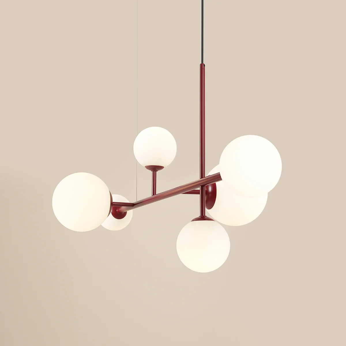 Efektowna lampa wisząca Dione z sześcioma mlecznymi kloszami w kształcie kul, przymocowanymi do metalowej, bordowej konstrukcji.