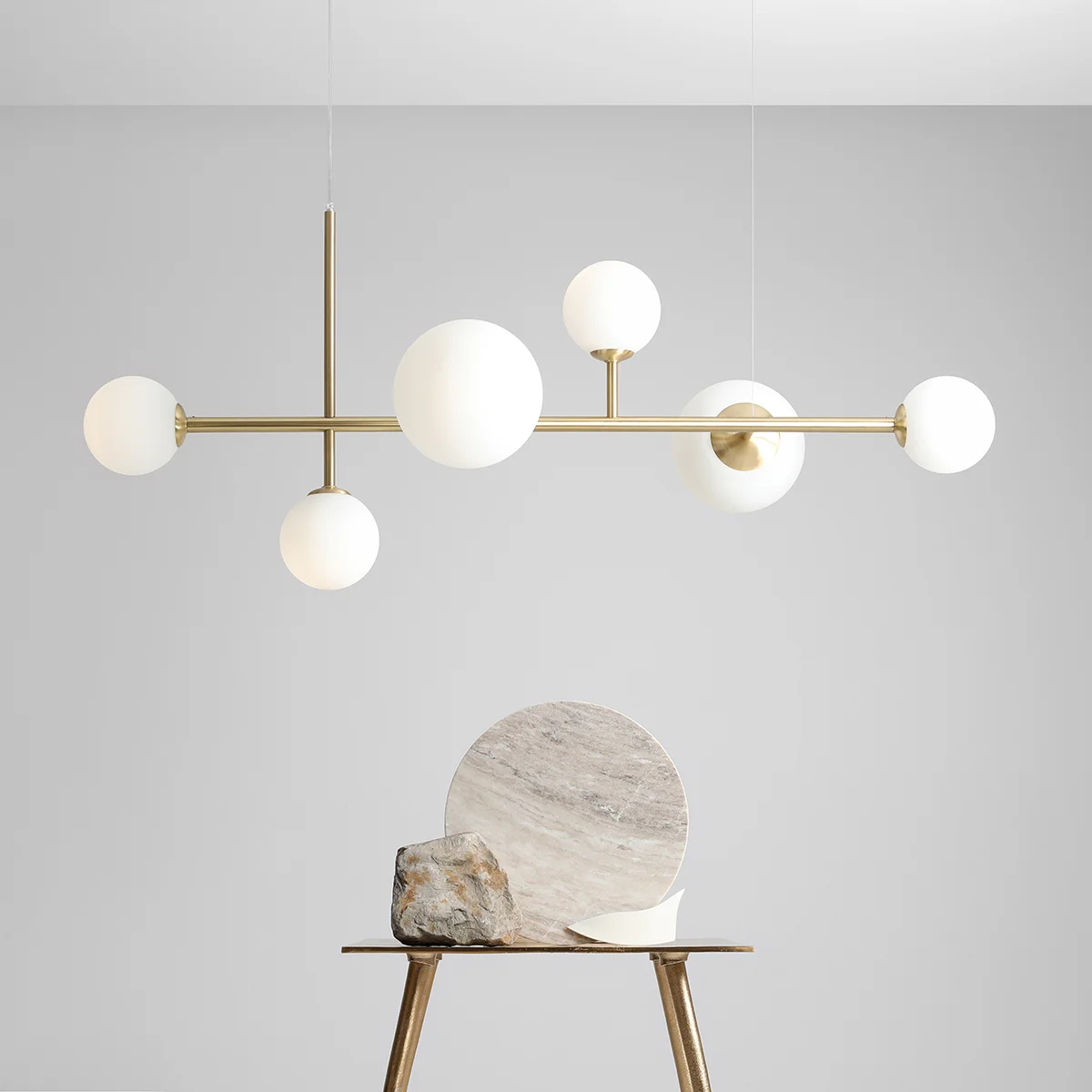 Rozmiary mosiężnej lampy z białymi kulami sprawiają, że jest to idealne oświetlenie do salonu lub jadalni nad stół czy wyspę kuchenną.