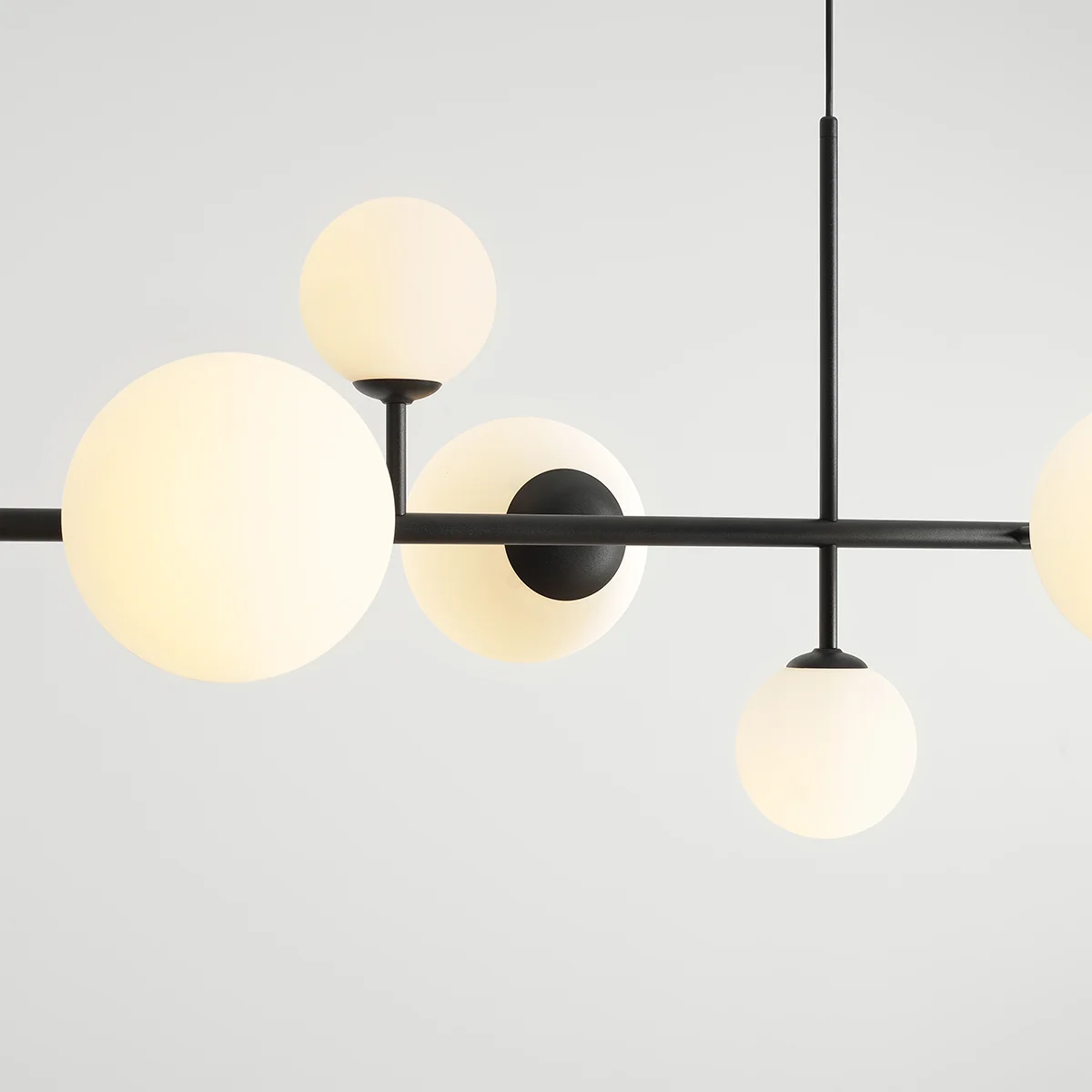 Białe kule lampy wiszącej wykonane są ze szkła polskiej produkcji. Wydobywające się z nich światło jest odpowiednio rozproszone.