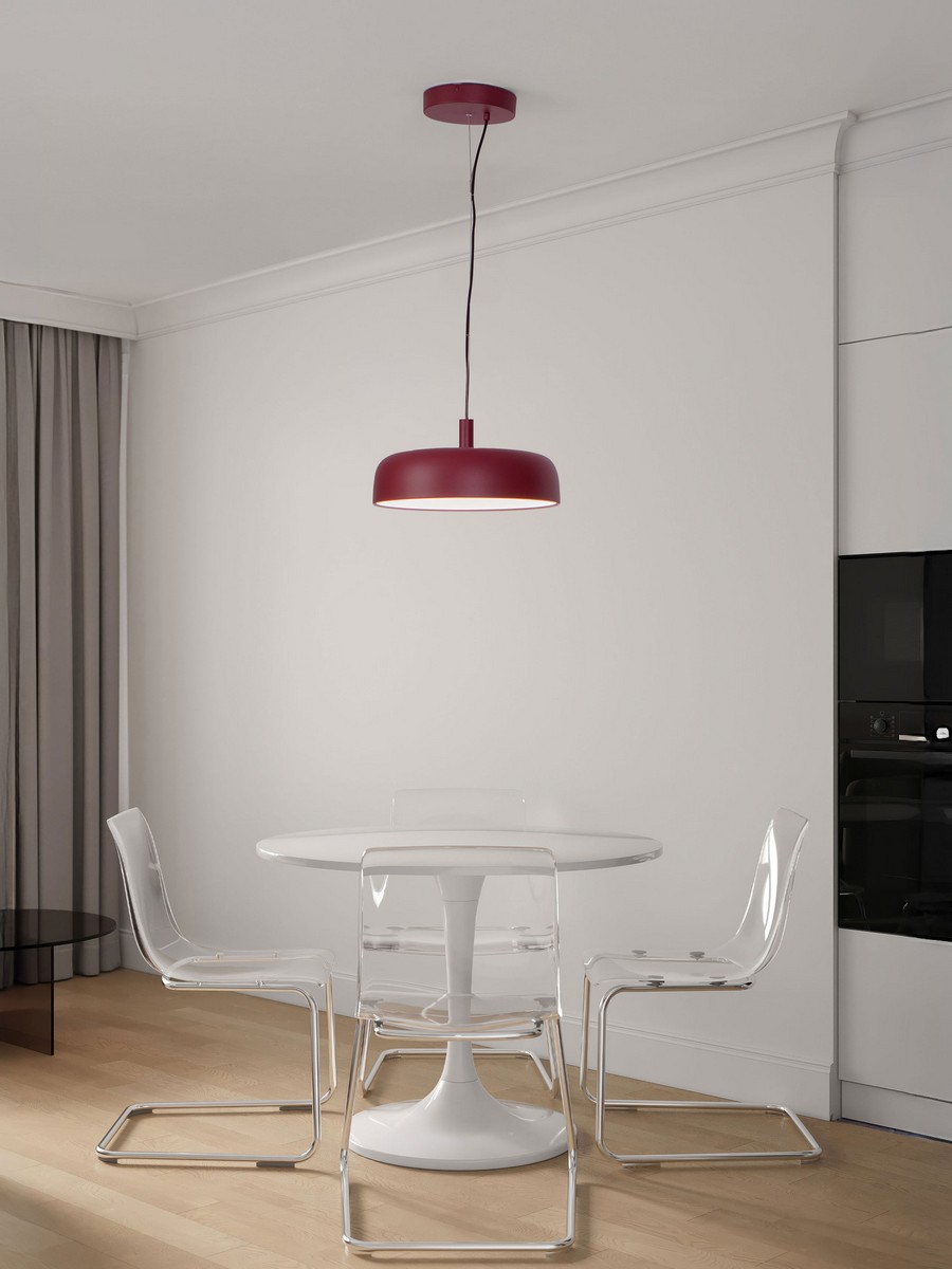 Lampa wisząca Dorria od marki Nova Luce to wyjątkowa propozycja dla osób, które pragną wprowadzić do wnętrza wyrazisty akcent kolorystyczny, zachowując przy tym pełną prostotę formy. Jej minimalistyczny klosz został wykończony w szlachetnym, matowym odcieniu ciemnej czerwieni (bordo). Taka kolorystyka nadaje oprawie elegancji i sprawia, że lampa staje się biżuteryjnym detalem, który ożywia nowoczesne aranżacje.