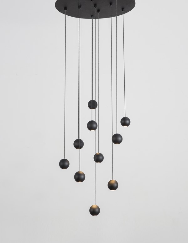 Ecija Disc to designerska lampa wisząca, która zachwyca swoją geometryczną formą i niebanalnym układem świetlnym. Składająca się z wielu kulistych kloszy zawieszonych na różnej długości przewodach, tworzy przestrzenną, dynamiczną kompozycję przypominającą instalację artystyczną. Wykonana z aluminium, łączy w sobie lekkość wizualną z trwałością materiałów, dzięki czemu stanowi efektowny i praktyczny element wystroju wnętrza.
