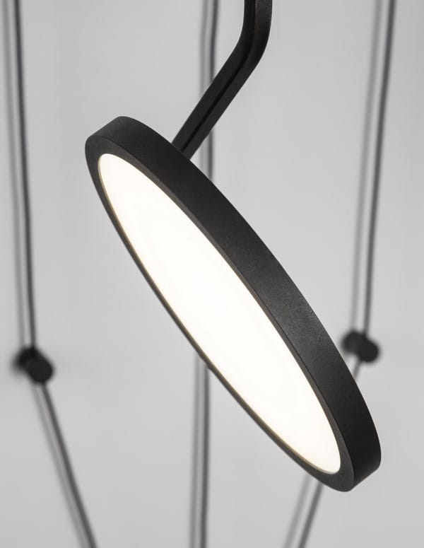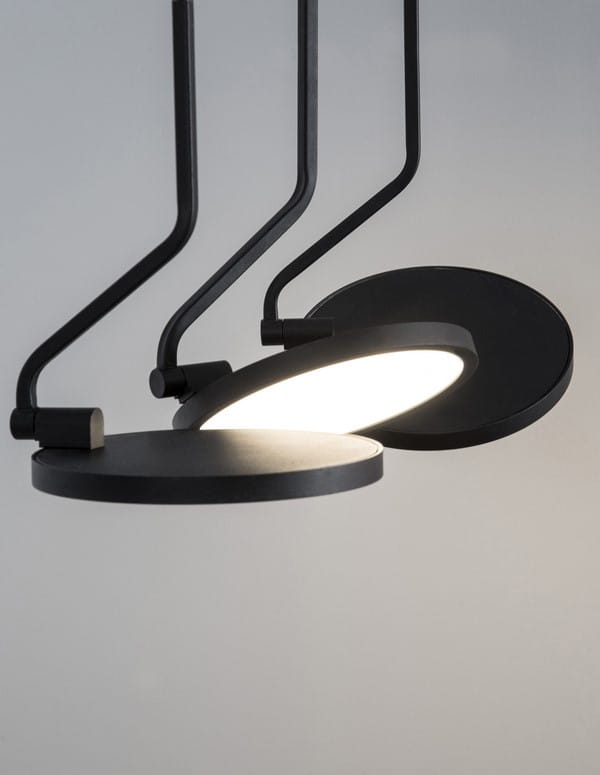 Lampa Falda cechuje się surową estetyką, która doskonale komponuje się z wnętrzami w stylu industrialnym. Jej minimalistyczna forma, oparta na prostych liniach i geometrycznych kształtach, wprowadza do pomieszczenia niepowtarzalny klimat. Konstrukcja lampy wykonana jest w całości z aluminium i składa się z 3 kloszy umieszczonych liniowo obok siebie. Klosz lampy ma formę płaskiego dysku, w którym znajduje się wbudowane źródło światła LED, skryte pod akrylową osłonką. Czarny, matowy kolor podkreśla jej nowoczesny, industrialny charakter.