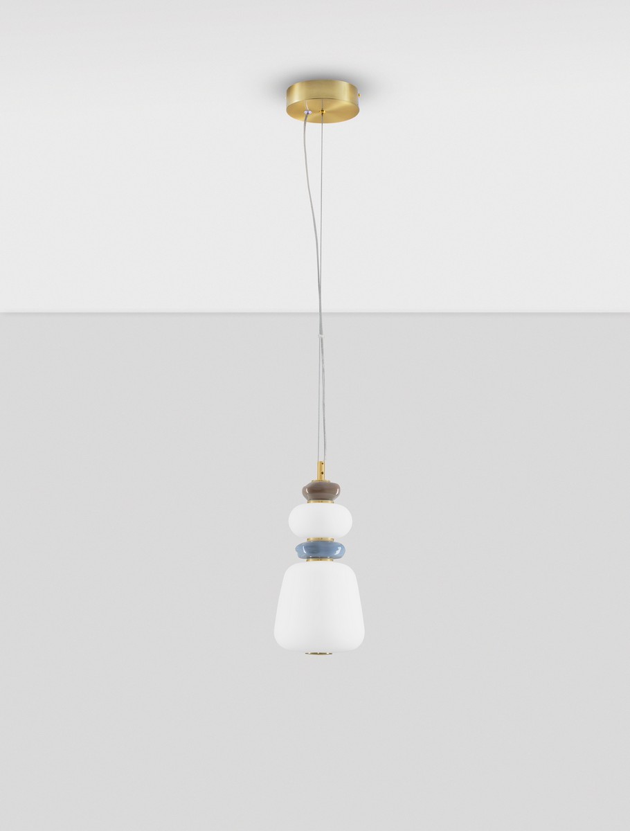 Oprawy wykonane zostały z połączenia ręcznie formowanego szkła i szlachetnej porcelany, co nadaje im elegancji i subtelnego charakteru. Zestawienie głębokiego brązu, pastelowego błękitu i satynowego złota tworzy harmonijną i wysmakowaną paletę barw, która doskonale wpisuje się zarówno w nowoczesne, jak i bardziej klasyczne aranżacje wnętrz.