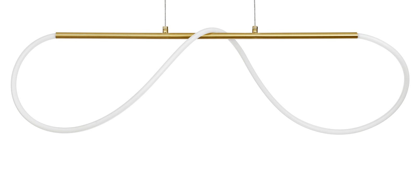 Prosta konstrukcja lampy wykonana została z wysokiej jakości aluminium w eleganckim, złotym kolorze, nadając całości solidnego i trwałego wykończenia. Stelaż finezyjnie oplata mlecznobiały, elastyczny klosz wykonany z akrylu, w którym ukryte jest źródło światła LED. Wyjątkowe połączenie złota z białym wężem nadaje oświetleniu unikalnego charakteru, tworząc świetlisą rzeźbę zawieszoną w powietrzu.
