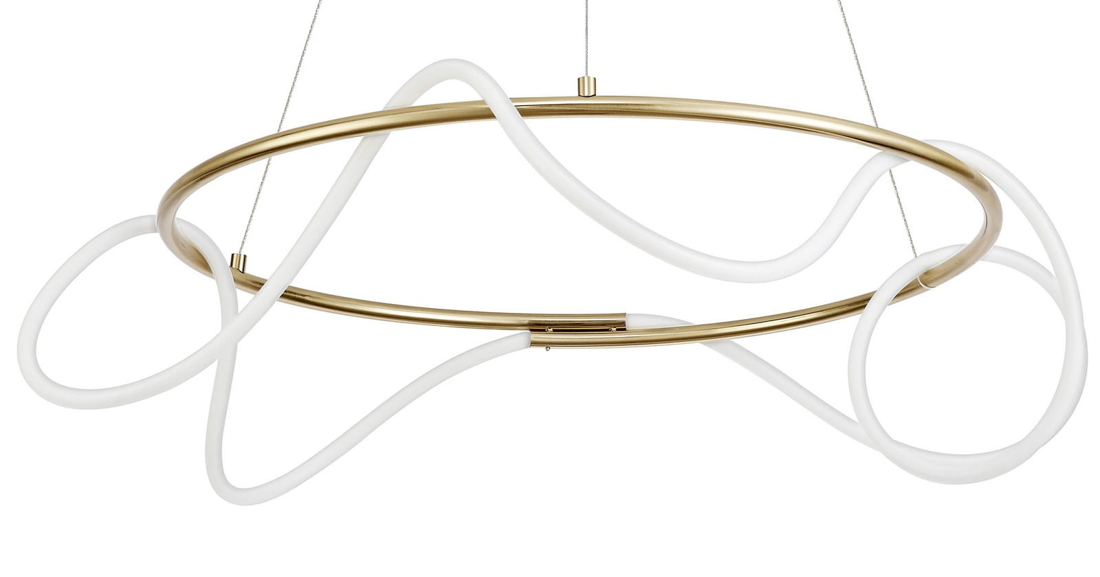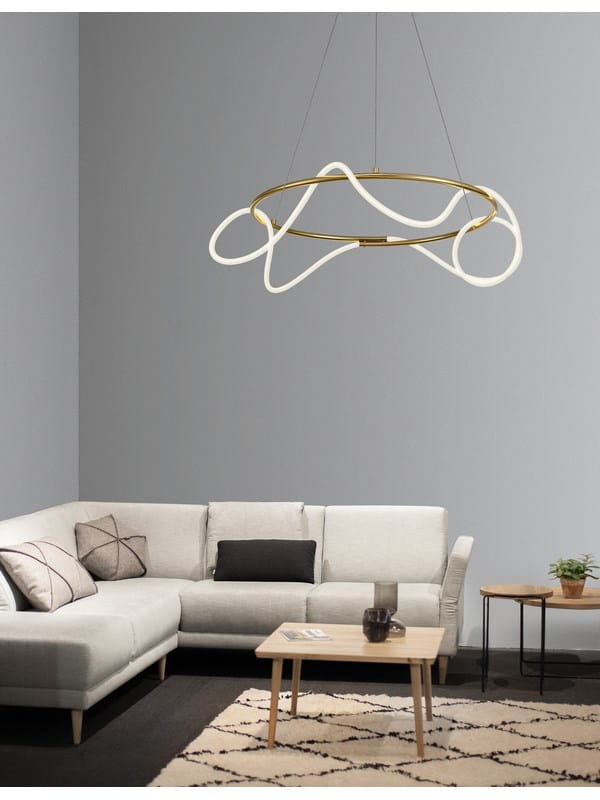 Lampa Fijo to połączenie nowoczesnego designu i eleganckiego minimalizmu. Jej charakterystyczną cechą jest złoty, aluminiowy ring, który stanowi ramę dla dynamicznie poprowadzonego białego przewodu świetlnego z akrylu. Ten nietuzinkowy duet tworzy efekt przestrzennej rzeźby zawieszonej w powietrzu – lampy, która przyciąga wzrok i nadaje wnętrzu wyjątkowego charakteru.