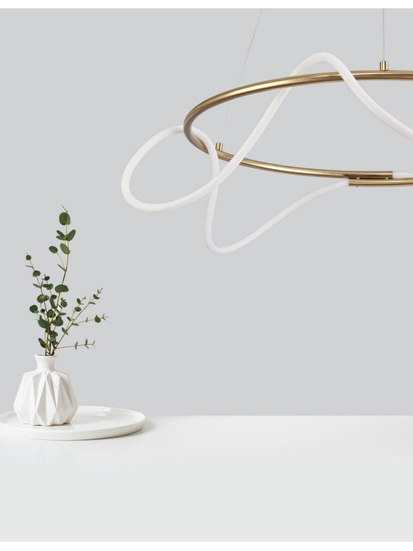 Organiczna linia świetlna oplata metalowy pierścień w sposób płynny i swobodny. Dzięki subtelnej kolorystyce – ciepłemu odcieniowi złota i mlecznobiałemu światłu – Fijo doskonale komponuje się z wnętrzami w stylu nowoczesnym, skandynawskim, japandi czy soft loft.