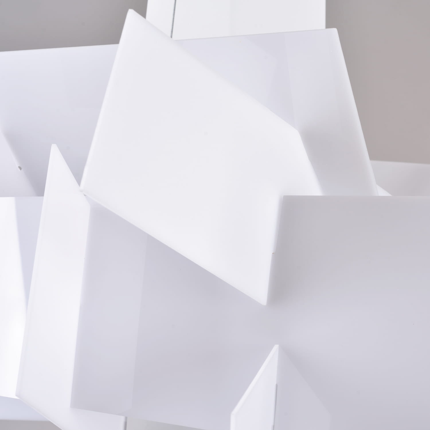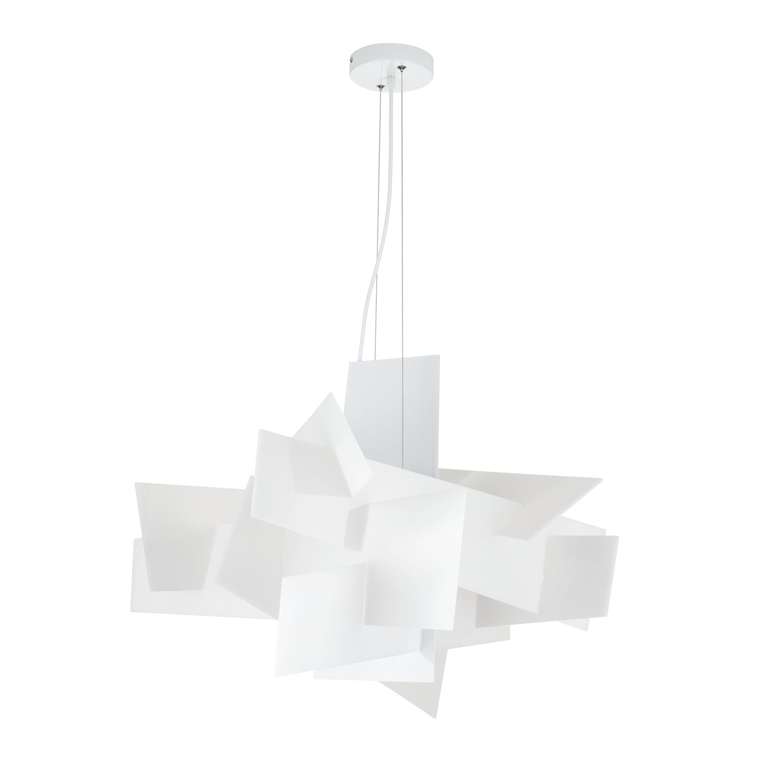 Oprawa składa się z abstrakcyjnej konstrukcji wykonanej z akrylu w białym kolorze. Swym wyglądem przypomina geometryczną formę złożoną z kartek papieru, co zapewnia jej niepowtarzalny i zaskakujący design. Lampa zawieszona jest na transparentnym przewodzie, wychodzącym z białej, matowej podsufitki.