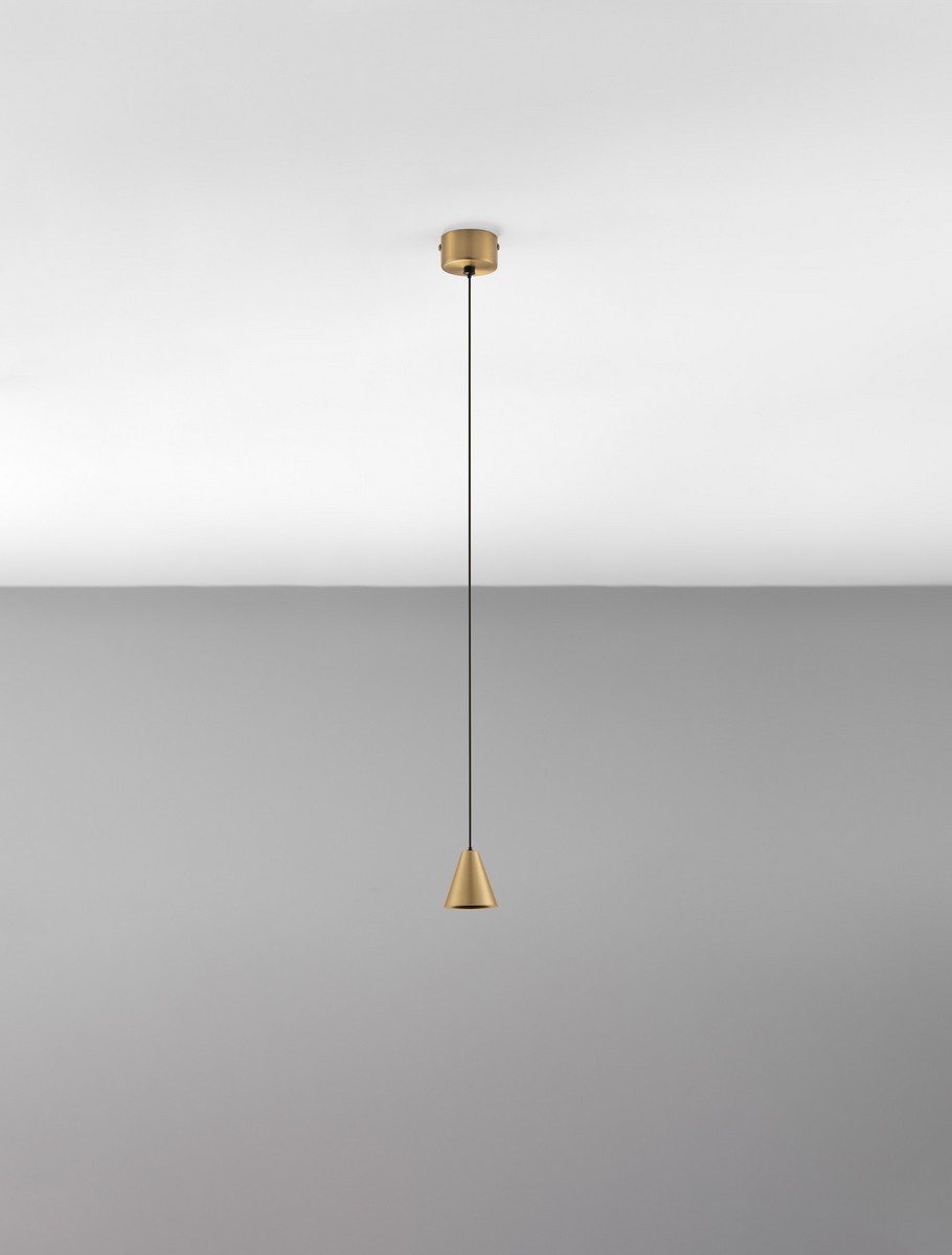 Lampa wisząca Gronvilo to eleganckie i nowoczesne oświetlenie, które doskonale wpisuje się w estetykę minimalistycznych wnętrz. Jej subtelna forma przyciąga uwagę smukłym kształtem i oszczędnym designem. Wydłużony, niemal niewidoczny przewód zakończony jest niewielkim stożkowym kloszem wykonanym z aluminium, dostępnym w dwóch wersjach kolorystycznych: matowej czerni oraz satynowym złocie.
