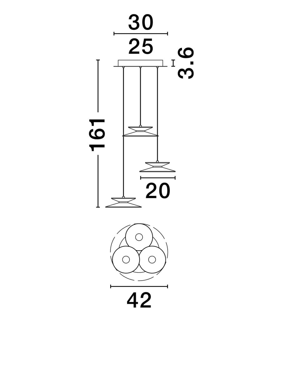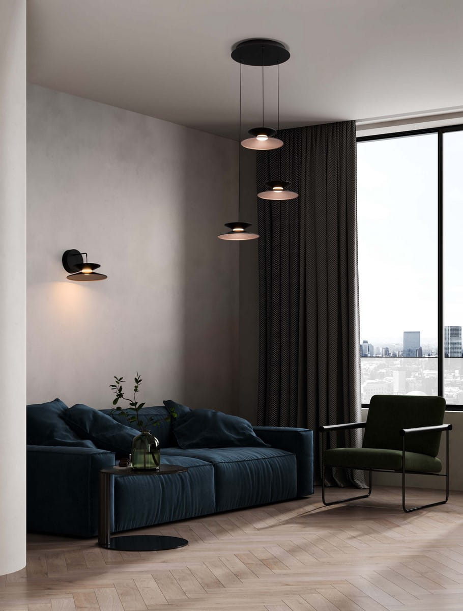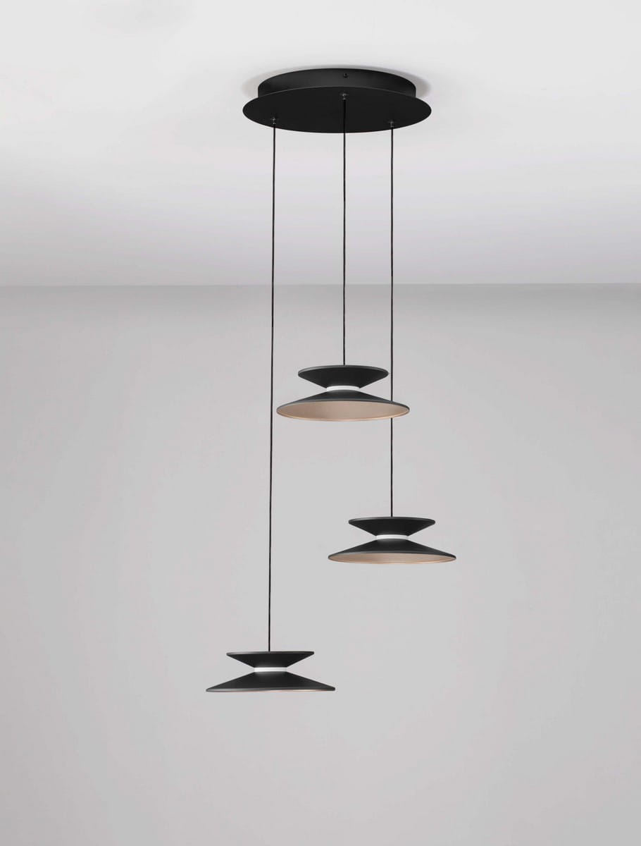 Wykonana z trwałych materiałów – stali, aluminium i akrylu – lampa jest nie tylko estetyczna, ale również funkcjonalna. Trzy klosze zawieszone na różnych wysokościach tworzą efekt wielopoziomowej kompozycji, która przyciąga uwagę i dodaje wnętrzu głębi. Czarne matowe klosze z subtelnym połyskiem wewnątrz idealnie komponują się z nowoczesnymi i eleganckimi aranżacjami.