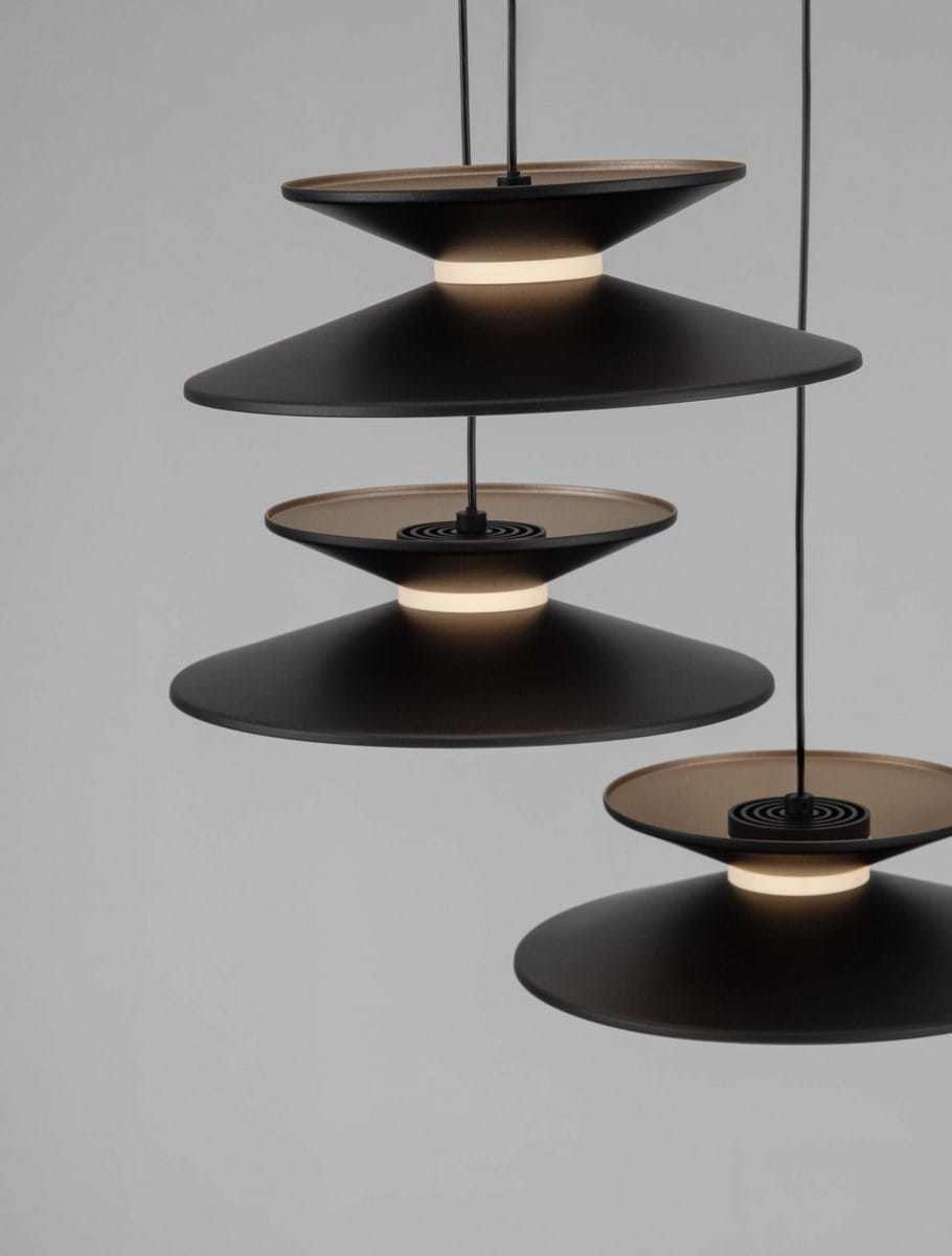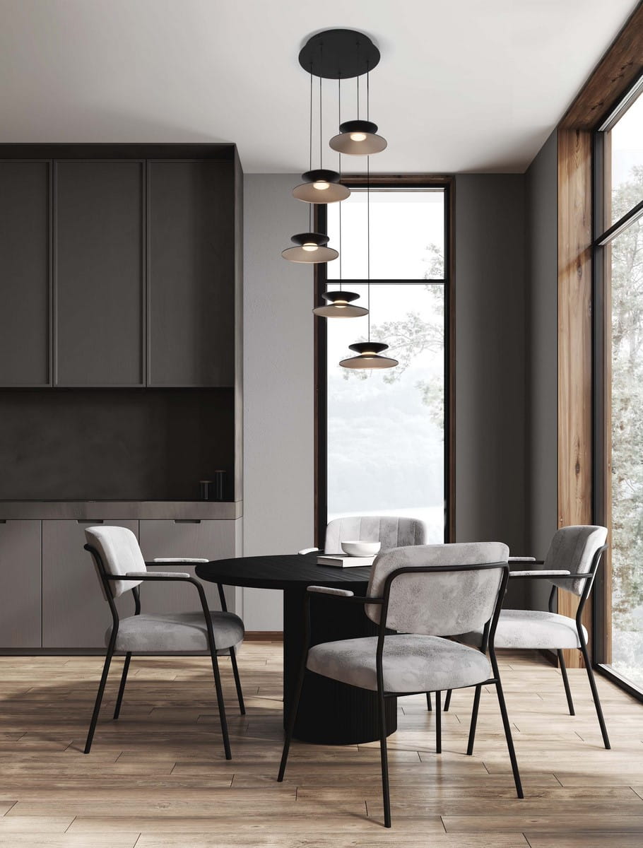 Wykonana z trwałych materiałów – stali, aluminium i akrylu – lampa jest nie tylko estetyczna, ale również funkcjonalna. Pięć kloszy zawieszonych na różnych wysokościach tworzą efekt wielopoziomowej kompozycji, która przyciąga uwagę i dodaje wnętrzu głębi. Czarne matowe klosze z subtelnym połyskiem wewnątrz idealnie komponują się z nowoczesnymi i eleganckimi aranżacjami.