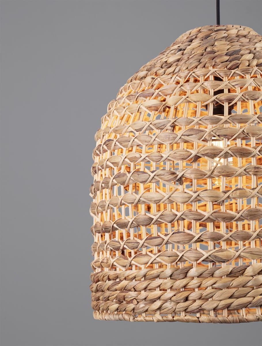 Design lamp Guardia charakteryzuje się miękkimi, zaokrąglonymi liniami i ażurową strukturą, która pozwala światłu delikatnie przenikać przez sploty, tworząc nastrojowe efekty świetlne na ścianach i suficie. Naturalne odcienie hiacyntu wodnego wprowadzają do pomieszczenia ciepłe, ziemiste tony, harmonijnie komponując się z innymi elementami wystroju w stylu boho, skandynawskim czy eko.