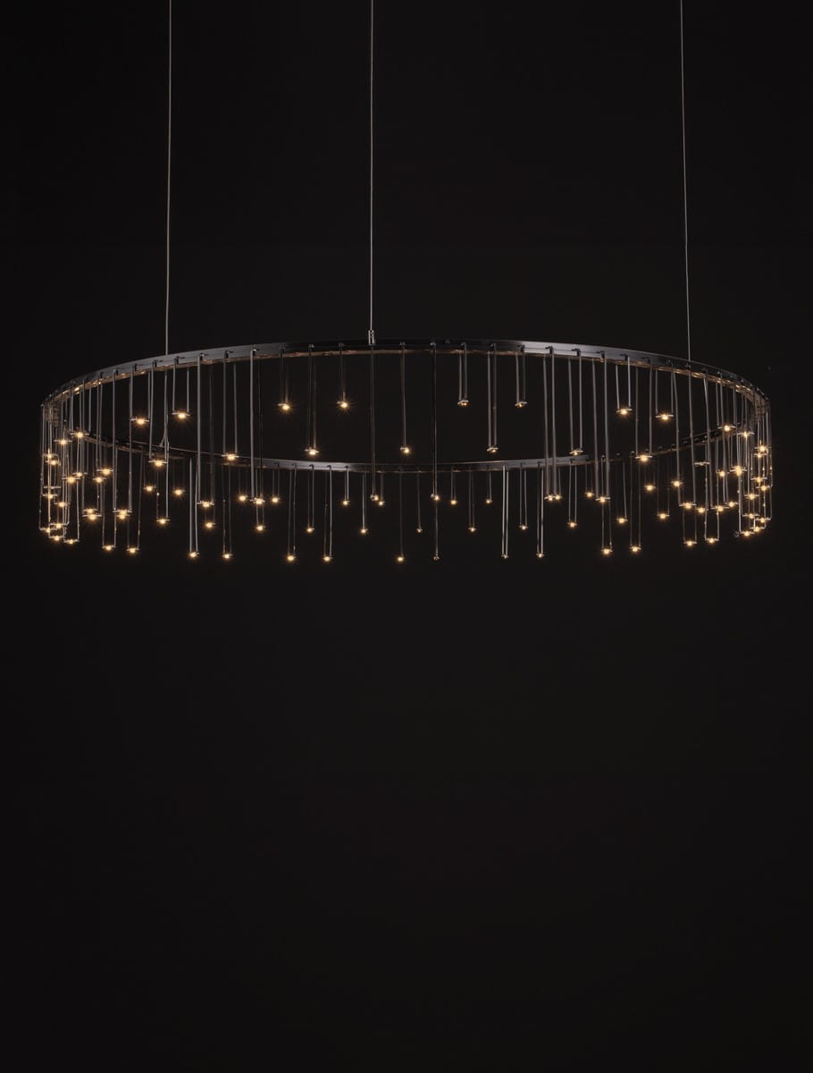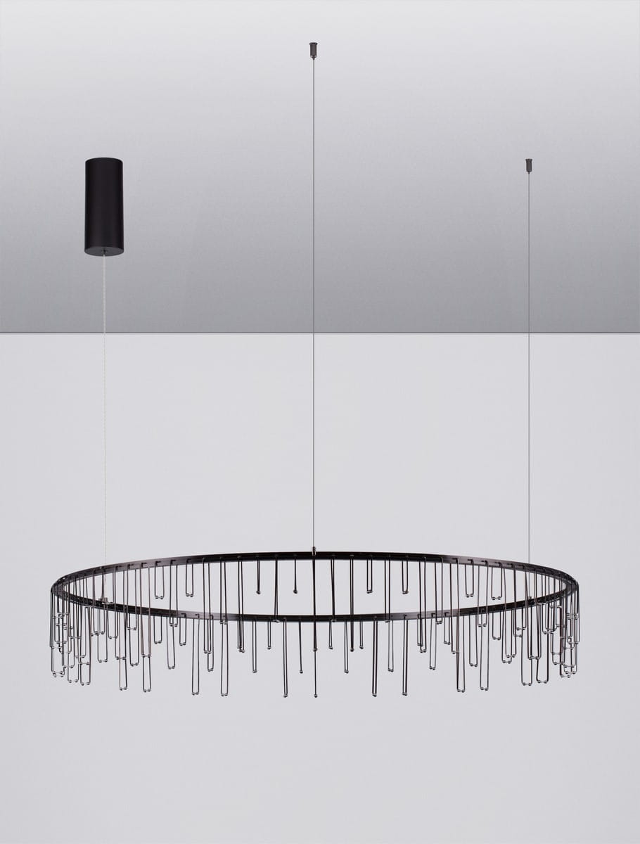 Jej unikalny design opiera się na okrągłej formie z wiszącymi metalowymi elementami, które tworzą delikatny efekt kaskadowy. Gdy lampa jest włączona, światło subtelnie przenika przez metalowe akcenty, nadając wnętrzu ciepłego blasku i wyjątkowego charakteru. Dzięki minimalistycznemu, ale jednocześnie efektownemu wzornictwu, Huaraz doskonale sprawdzi się jako centralny punkt w salonie, jadalni czy przestrzeni komercyjnej.