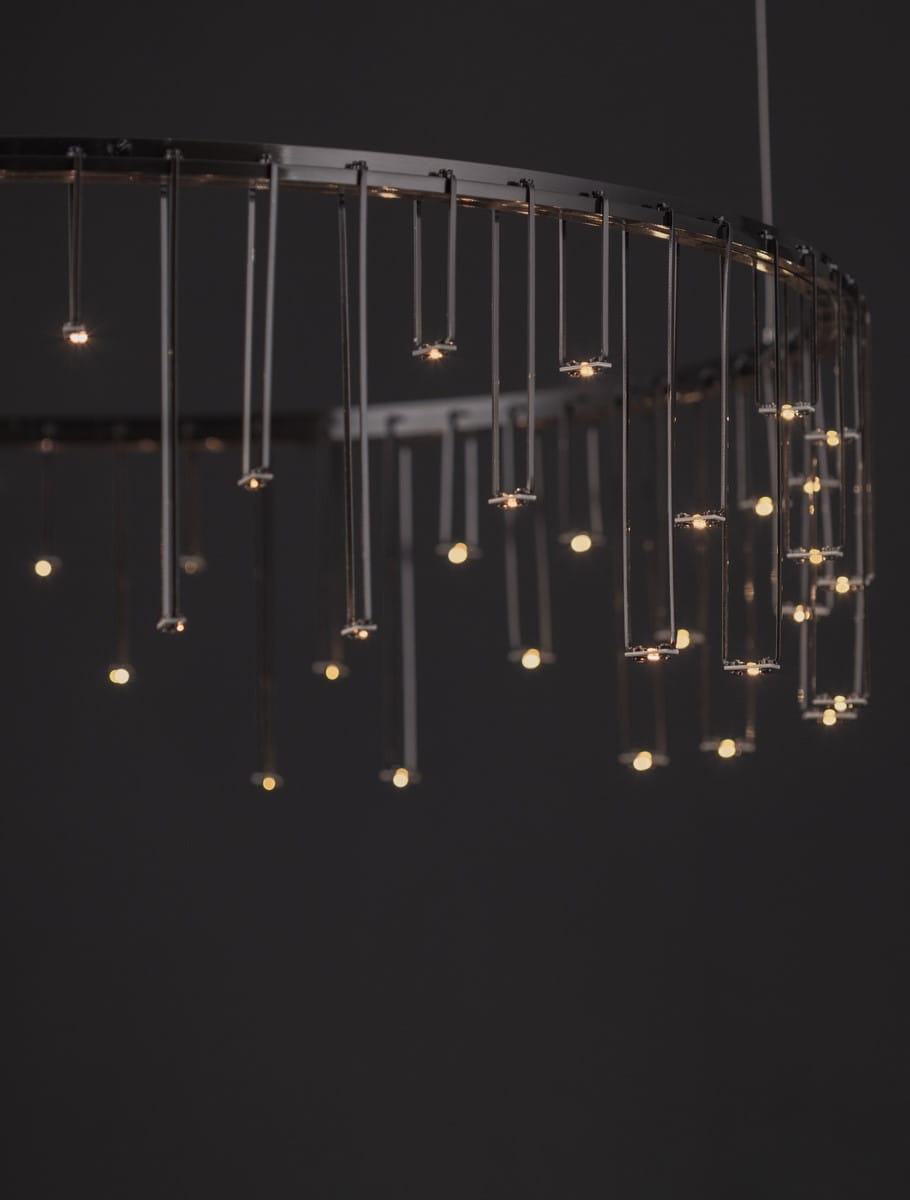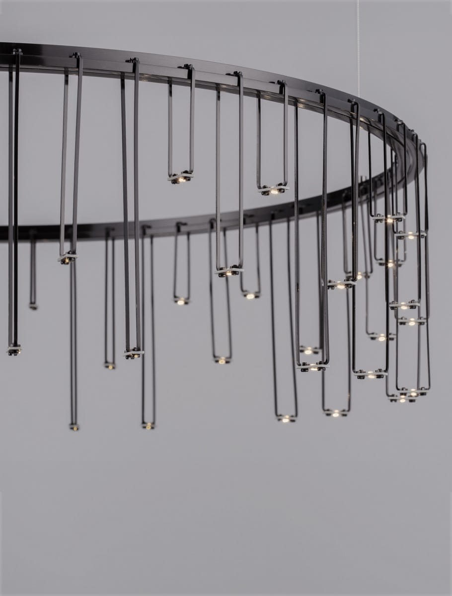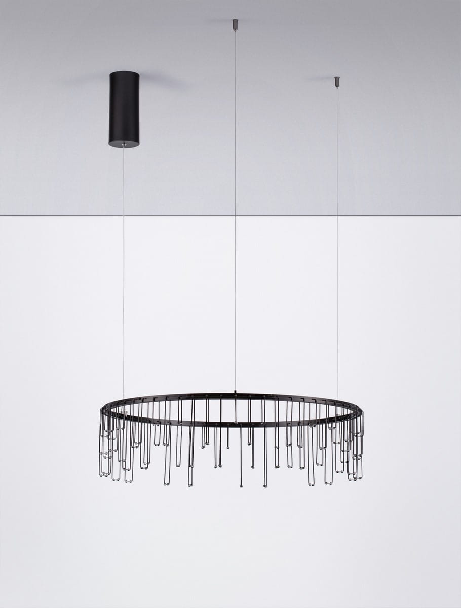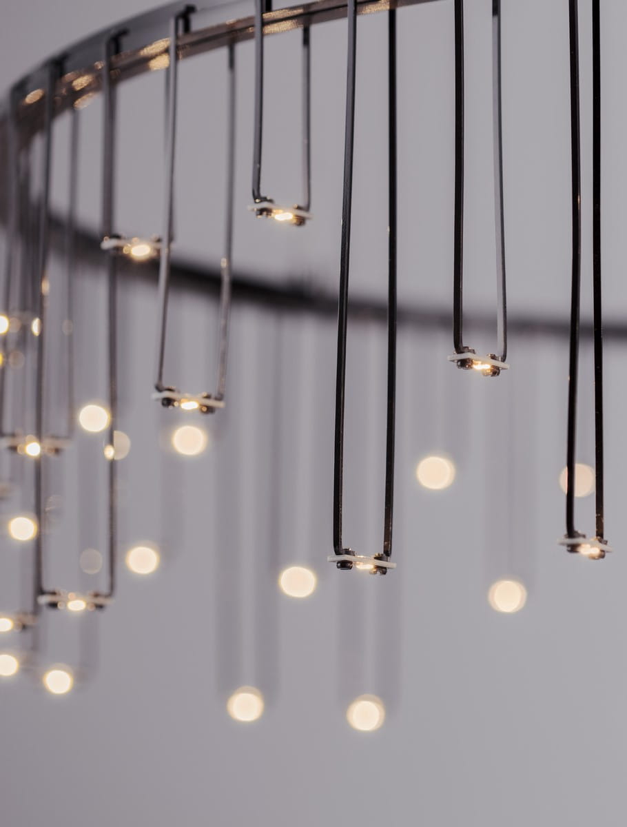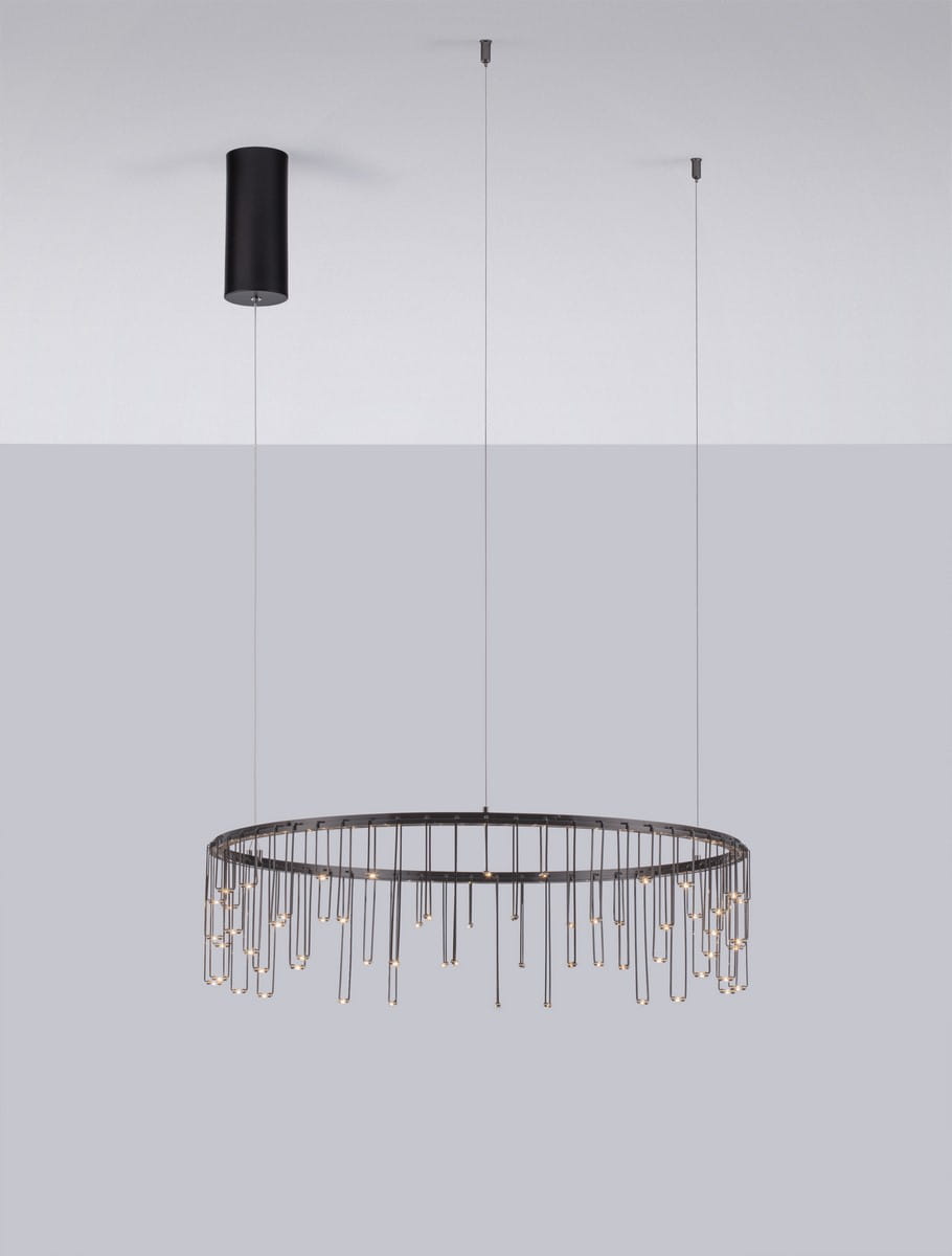 Jej unikalny design opiera się na okrągłej formie z wiszącymi metalowymi elementami, które tworzą delikatny efekt kaskadowy. Gdy lampa jest włączona, światło subtelnie przenika przez metalowe akcenty, nadając wnętrzu ciepłego blasku i wyjątkowego charakteru. Dzięki minimalistycznemu, ale jednocześnie efektownemu wzornictwu, Huaraz doskonale sprawdzi się jako centralny punkt w salonie, jadalni czy przestrzeni komercyjnej.