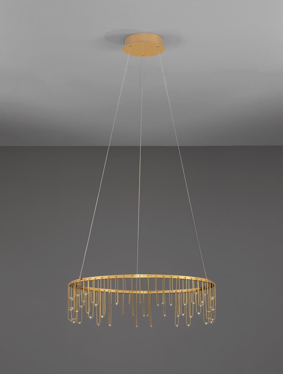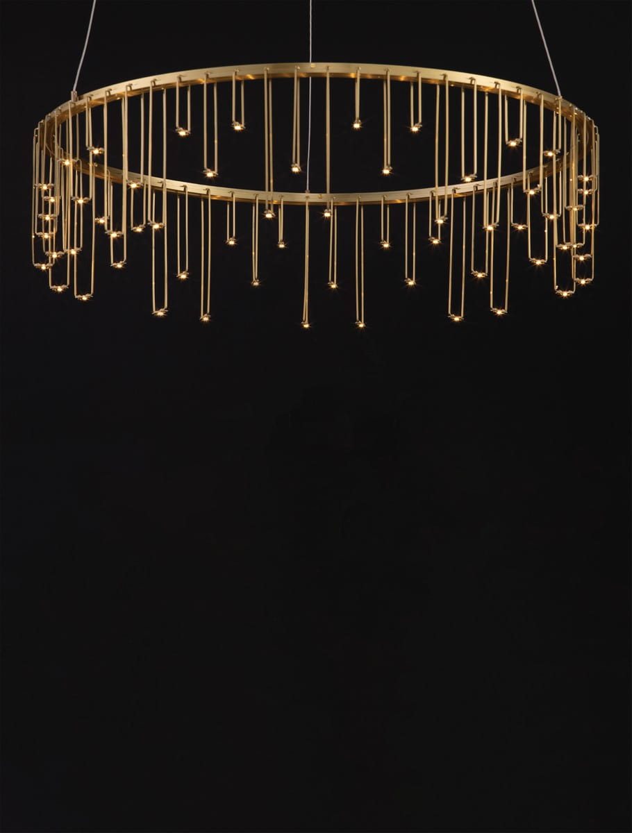 Jej unikalny design opiera się na okrągłej formie z wiszącymi metalowymi elementami, które tworzą delikatny efekt kaskadowy. Gdy lampa jest włączona, światło subtelnie przenika przez metalowe akcenty, nadając wnętrzu ciepłego blasku i wyjątkowego charakteru. Dzięki minimalistycznemu, ale jednocześnie efektownemu wzornictwu, Huaraz doskonale sprawdzi się jako centralny punkt w salonie, jadalni czy przestrzeni komercyjnej.