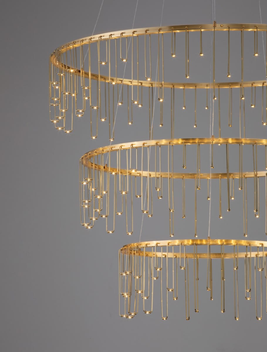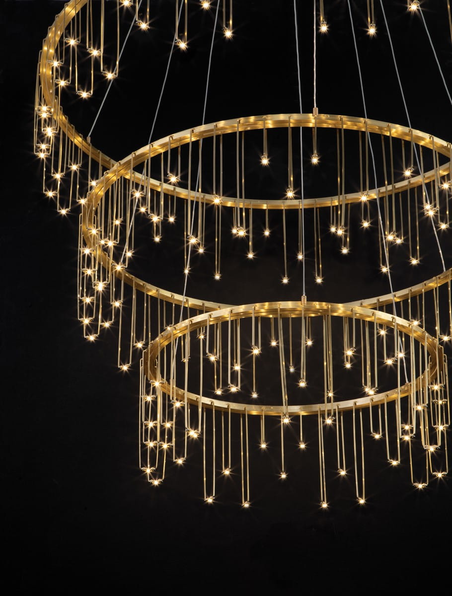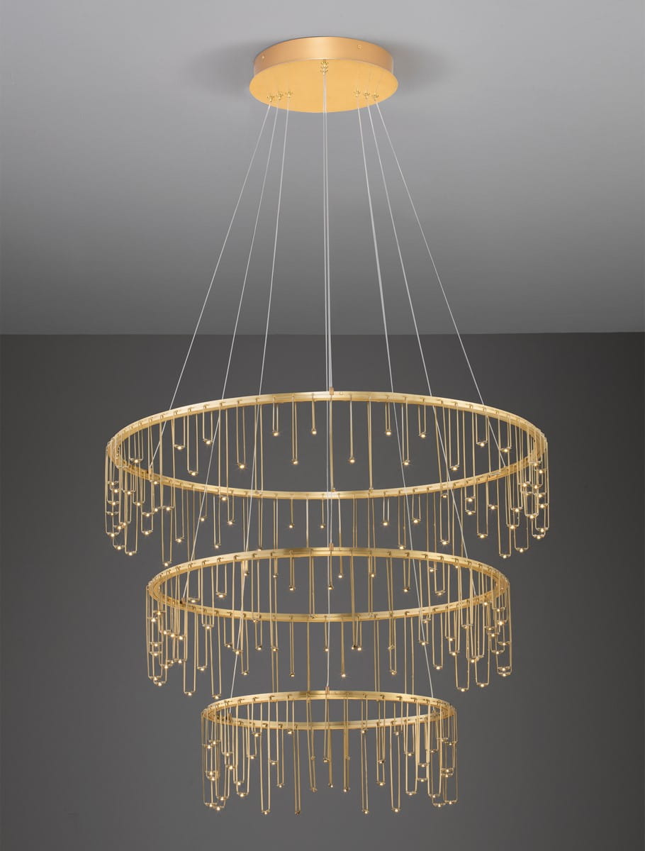 Huaraz double, z dwoma pierścieniami, doskonale sprawdzi się w mniejszych pomieszczeniach, nadając im elegancji i wyrazistości. Z kolei wersja triple, z trzema pierścieniami, imponuje rozmachem i jest idealnym wyborem do większych przestrzeni, takich jak salony, hole czy reprezentacyjne jadalnie.