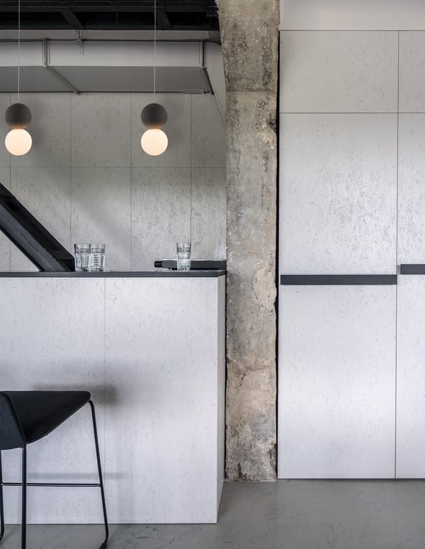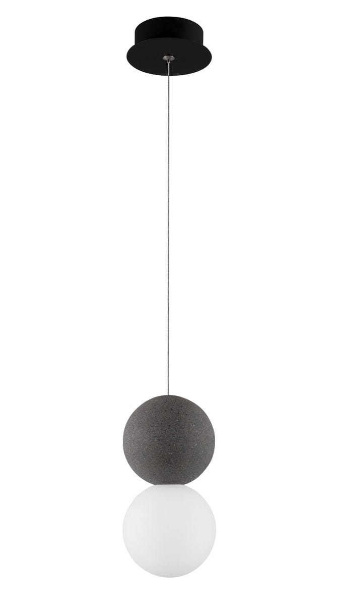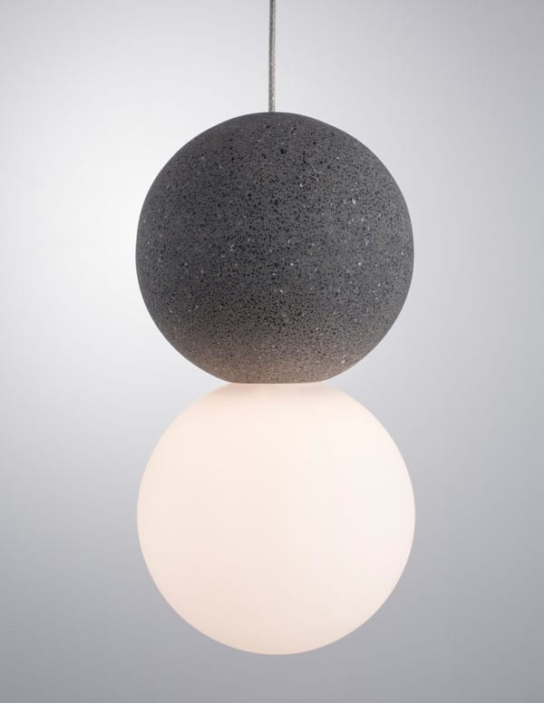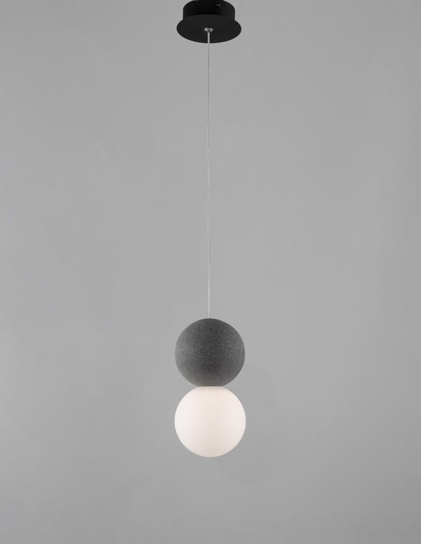 Lampa Ibague składa się z dwóch kul wykonanych z różnych materiałów. Górna wykonana została z surowego betonu w naturalnym szarym kolorze, który nadaje całości industrialnego charakteru. Ciemna szarość betonu pięknie kontrastuje z dolną kulą w mlecznym kolorze, wykonaną z matowego szkła. Zastosowanie szkła w dolnym kloszu wprowadza do wnętrza element lekkości i elegenacj. Ponadto dolna kula skrywa źródło światła, które jest przeznaczone na standardową żarówkę. Dzięki zastosowaniu matowego szkła, światło jest delikatnie rozproszone, tworząc przyjemną, nieoślepiającą poświatę.