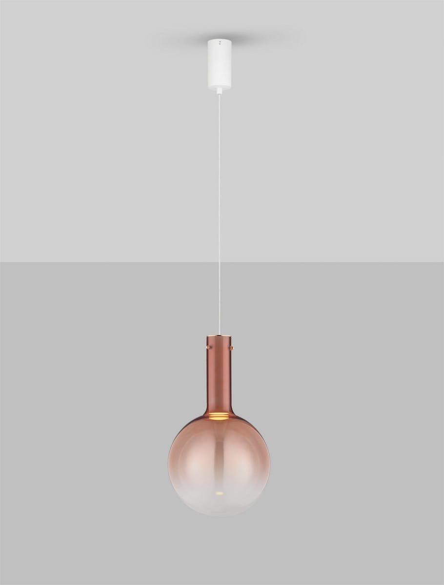 Lampa wisząca Javier to wyjątkowe połączenie minimalistycznego designu i elegancji, wykonana z różowego szkła i metalu. Jej unikalny klosz w kształcie kuli, subtelnie przechodzący od ciemnego różowego koloru do transparentności, tworzy wyjątkowy efekt wizualny, dodając przestrzeni wyrafinowania. Metalowe detale w matowym wykończeniu podkreślają nowoczesny charakter lampy.