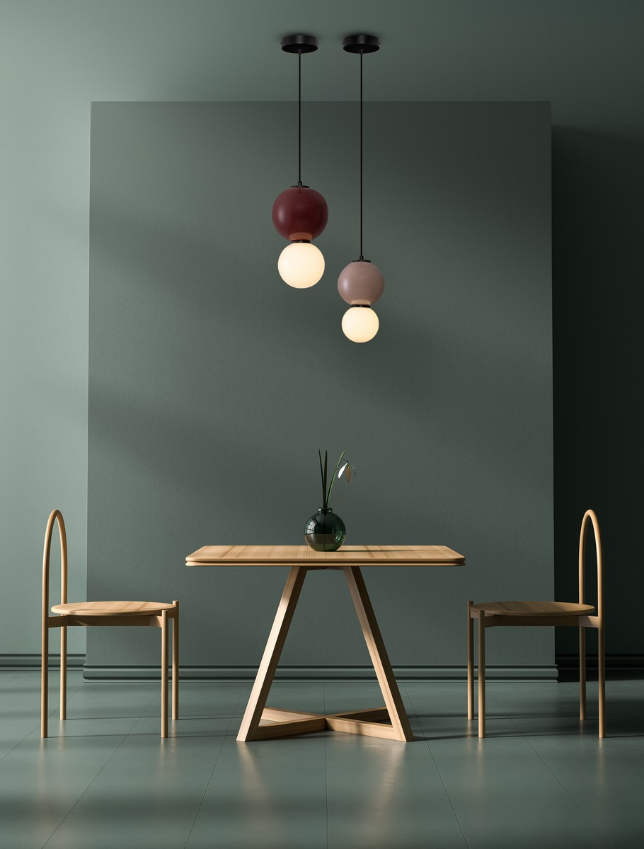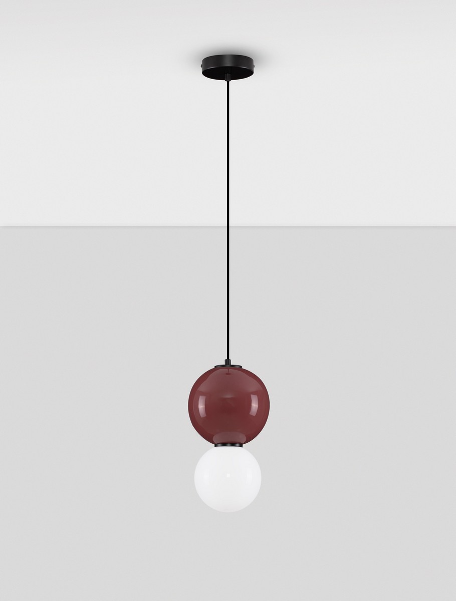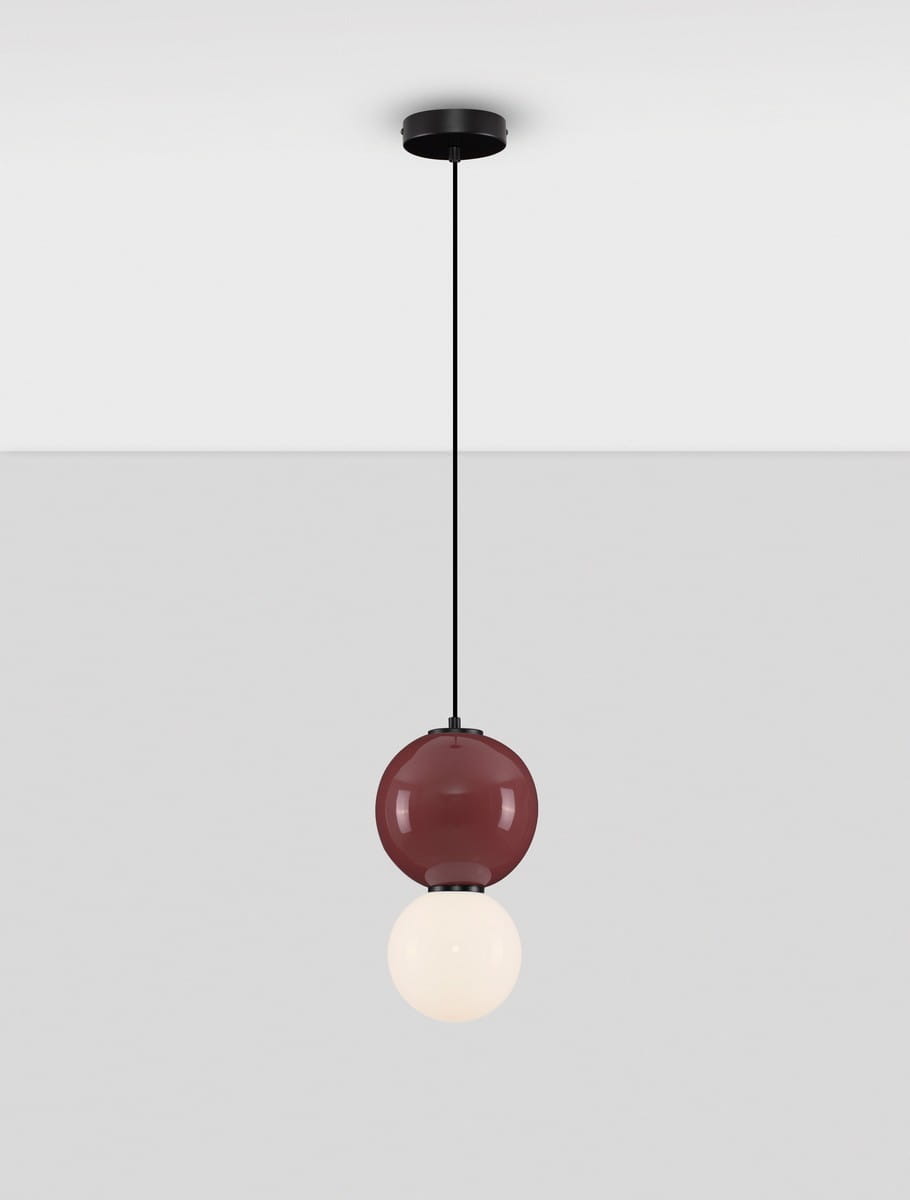 Lampa wisząca Jorelia to kwintesencja eleganckiego minimalizmu i wyrafinowanego wzornictwa. Wykonana z połączenia szkła i porcelany, z detalami z metalu, stanowi wyjątkową kompozycję estetyki i funkcjonalności. Jej forma opiera się na harmonijnym zestawieniu dwóch kulistych elementów – górna kula dostępna jest w czterech szlachetnych kolorach: szarym, beżowym, butelkowej zieleni oraz głębokim bordowym, natomiast dolna wykonana jest z mlecznobiałego szkła, które subtelnie rozprasza światło.