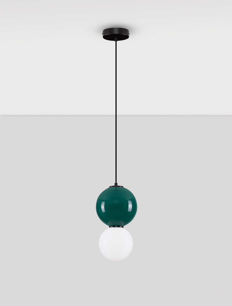 Lampa wisząca Jorelia to kwintesencja eleganckiego minimalizmu i wyrafinowanego wzornictwa. Wykonana z połączenia szkła i porcelany, z detalami z metalu, stanowi wyjątkową kompozycję estetyki i funkcjonalności. Jej forma opiera się na harmonijnym zestawieniu dwóch kulistych elementów – górna kula dostępna jest w czterech szlachetnych kolorach: szarym, beżowym, butelkowej zieleni oraz głębokim bordowym, natomiast dolna wykonana jest z mlecznobiałego szkła, które subtelnie rozprasza światło.