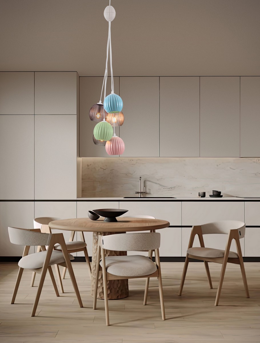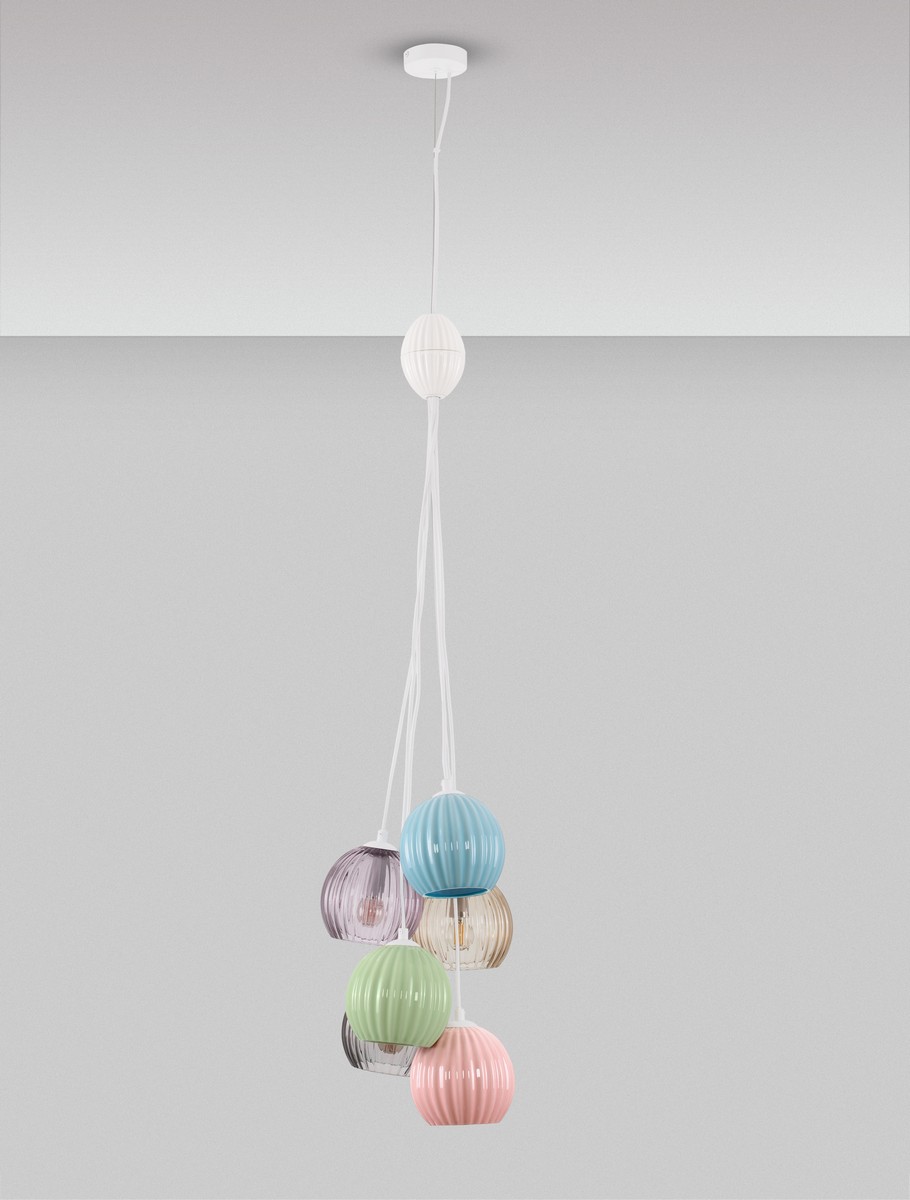 Lampa wisząca Lorevio to efektowny i wyrazisty element oświetlenia, który łączy funkcjonalność z dekoracyjnym designem. Jej unikatowy charakter tworzą kuliste klosze wykonane z barwionego szkła, zestawione w harmonijną kompozycję kolorów – od pastelowego różu i mięty po eleganckie, dymione tonacje. Całość została zawieszona na metalowej rozecie i przewodach w kolorze białym, dzięki czemu lampa prezentuje się lekko i nowocześnie.