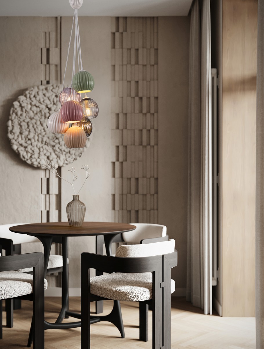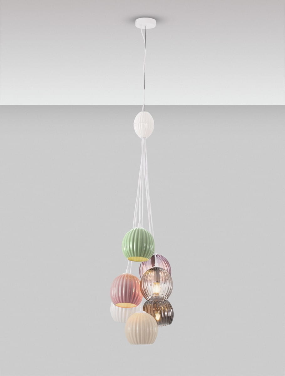Lampa wisząca Lorevio to efektowny i wyrazisty element oświetlenia, który łączy funkcjonalność z dekoracyjnym designem. Jej unikatowy charakter tworzą kuliste klosze wykonane z barwionego szkła, zestawione w harmonijną kompozycję kolorów – od pastelowego różu i mięty po eleganckie, dymione tonacje. Całość została zawieszona na metalowej rozecie i przewodach w kolorze białym, dzięki czemu lampa prezentuje się lekko i nowocześnie.