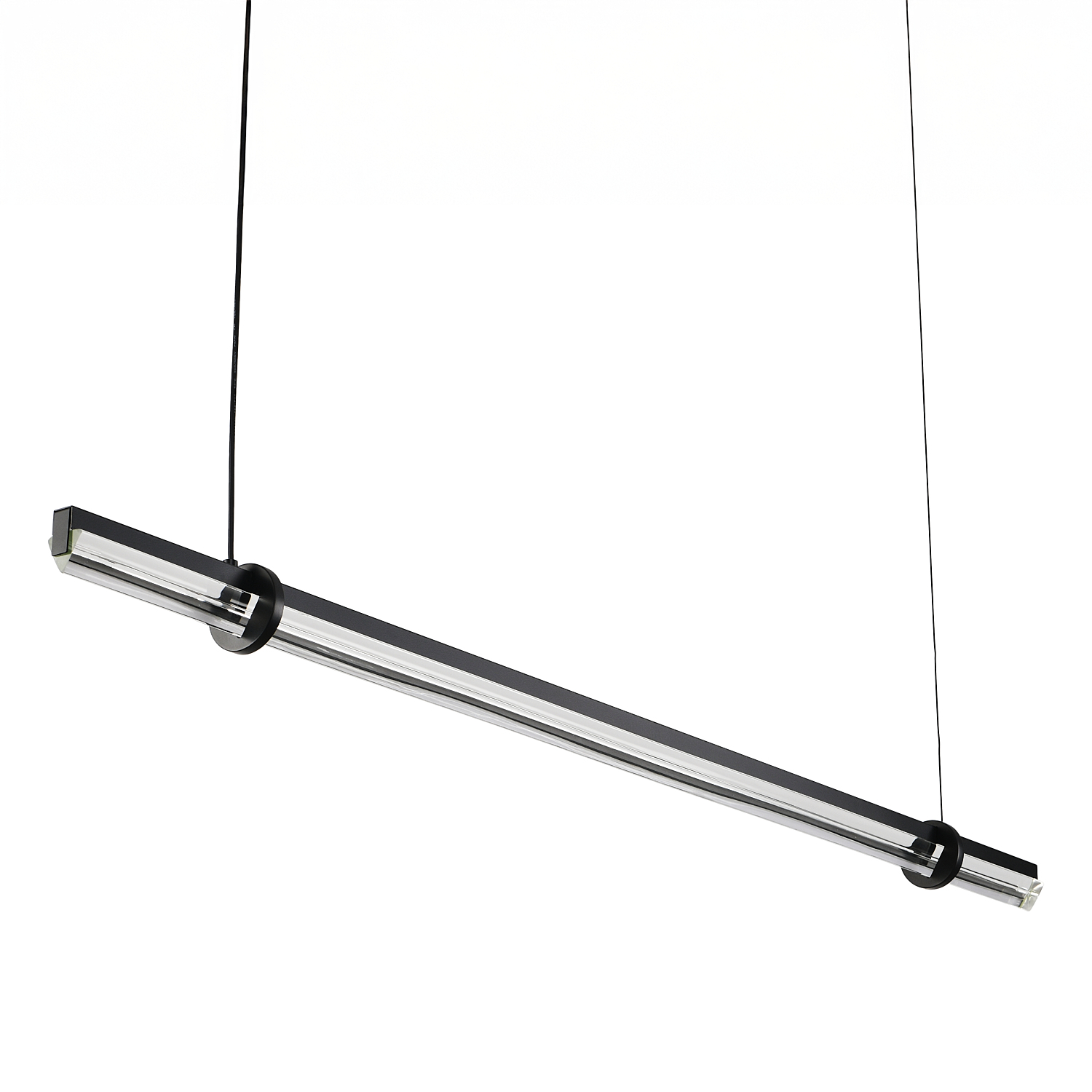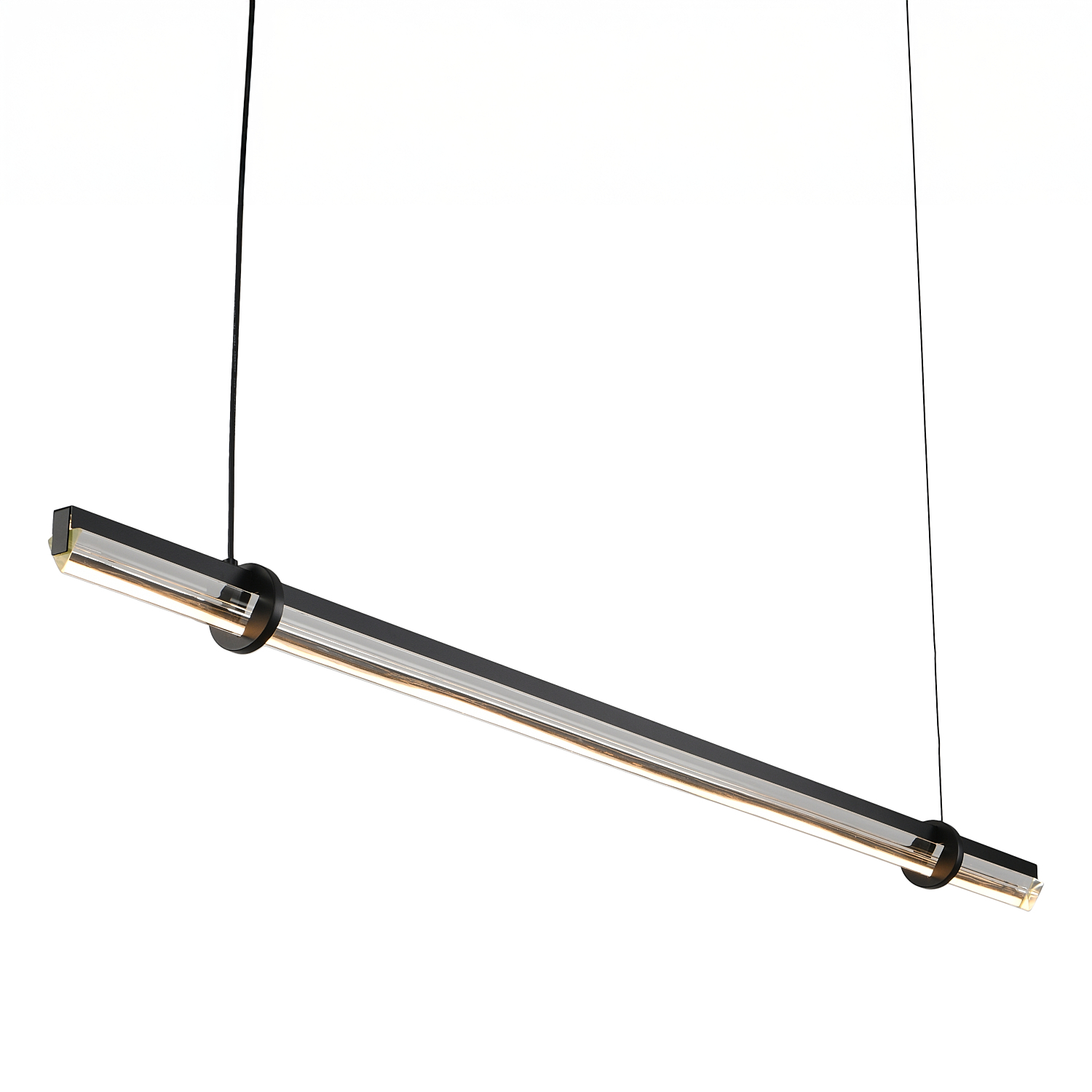 Lampa zawieszona jest na dwóch cienkich stalowych linkach w kolorze czarnym, które można swobodnie regulować. Pozwala to na łatwe dopasowanie wysokości zawieszenia do indywidualnych potrzeb i wysokości pomieszczenia. To praktyczne rozwiązanie, które jednocześnie podkreśla nowoczesny, geometryczny charakter lampy.