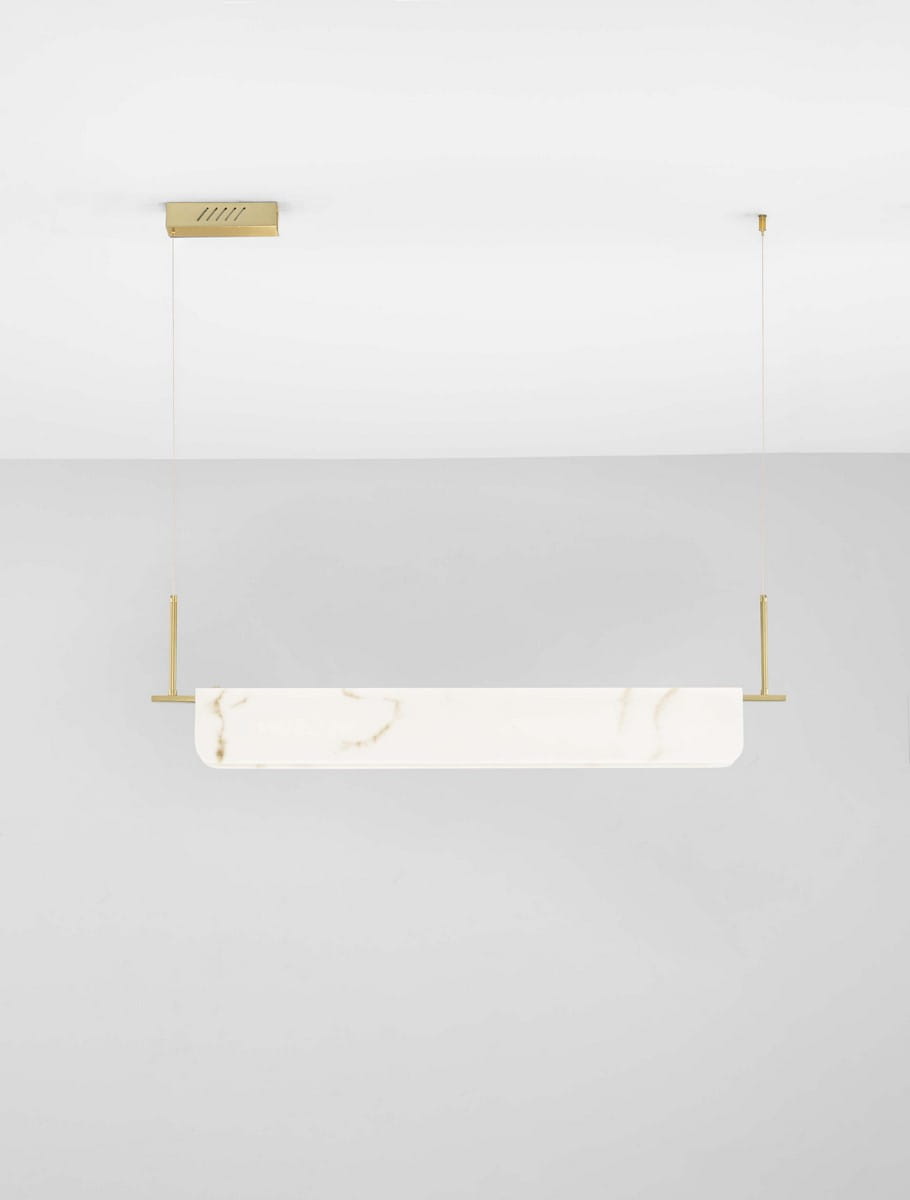 Lampa wisząca Mairana Line to kwintesencja nowoczesnego designu i elegancji, doskonale wpisująca się w różnorodne aranżacje wnętrz, od stylu glamour po minimalistyczne przestrzenie. Wykonana z wysokiej jakości białego marmuru oraz metalu w złotym wykończeniu, lampa emanuje luksusem i wyrafinowaniem.