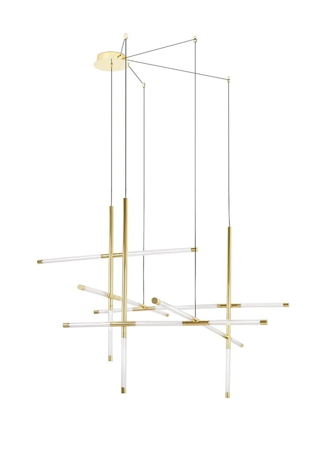 Minimalistyczne źródła światła zostały osadzone na końcach transparentnych kloszy wykonanych z akrylu, subtelnie wtopionych w złote, metalowe wykończenia. Kontrast pomiędzy połyskującym złotem a lekkością przezroczystych elementów nadaje lampie elegancji i nowoczesnego charakteru.
