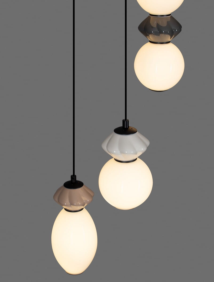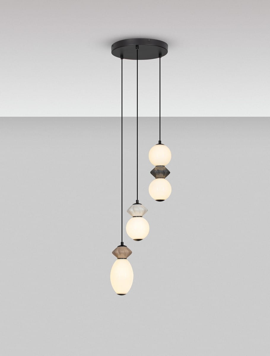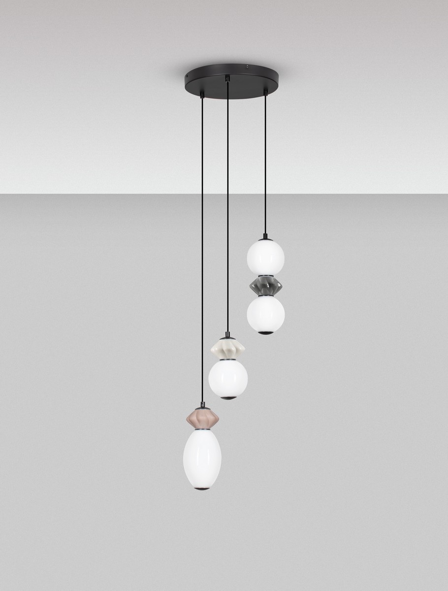 Lampa wisząca Monreta Trio to wyraziste połączenie nowoczesnej estetyki i artystycznego designu. Składa się z trzech dekoracyjnych kloszy wykonanych z ceramiki i szkła, zawieszonych na różnych wysokościach na czarnej podsufitce. Każdy z kloszy przyciąga uwagę unikalnym kształtem i zestawieniem barw – od neutralnych beżów i bieli, po kontrastujące akcenty w odcieniach szarości i brązu.