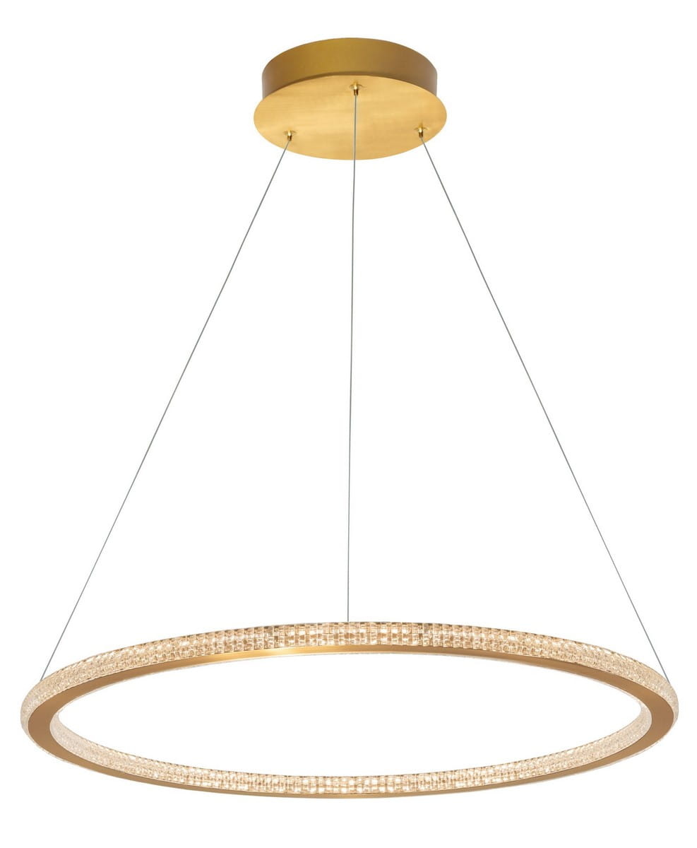 Lampa Monte ma formę ringu, wykonanego z aluminium w eleganckim, złotym kolorze. Posiada okrągłą podsufitkę o tym samym, złotym wykończeniu, które doskonale komponuje się z resztą konstrukcji. Jest bogato ozdobiona szeregiem błyszczących kryształków, które pokrywają całą wewnętrzną i zewnętrzną powierzchnię, tworząc niepowtarzalny efekt świetlny. Lampa posiada wbudowane źródło światła LED skryte pod akrylową osłonką.