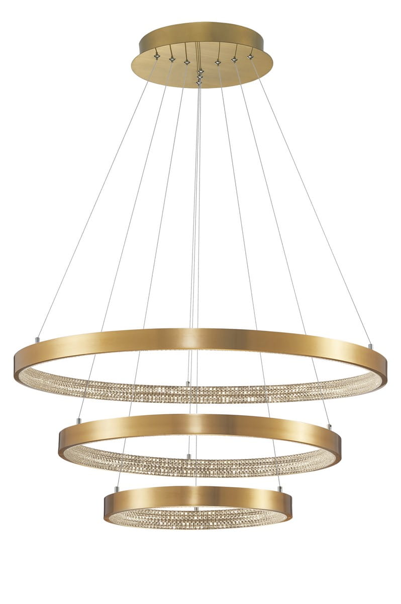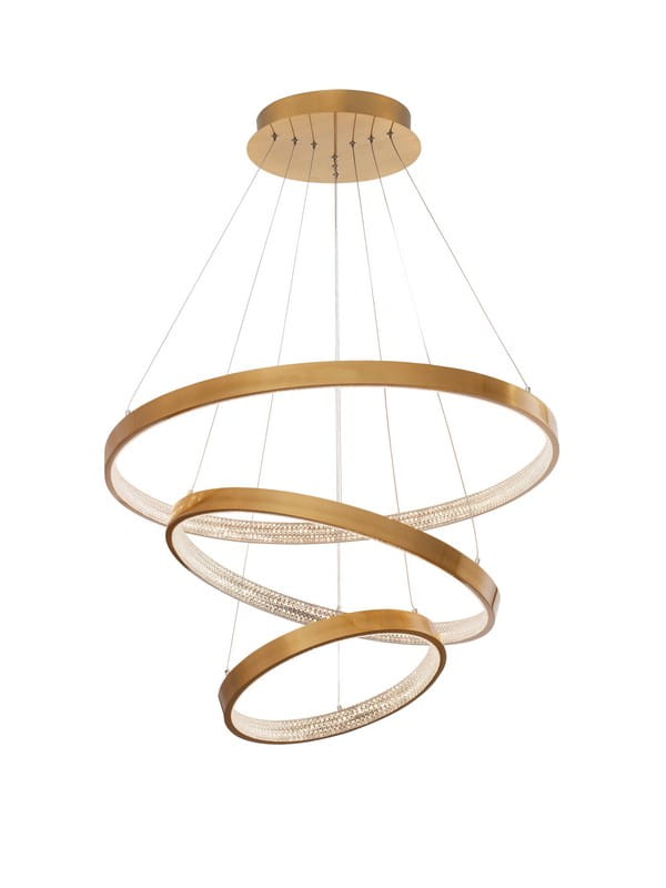 Kompozycja składa się z trzech ringów zawieszonych kaskadowo i wykonana została z aluminium w złotym kolorze o odcieniach antycznego mosiądzu. Jest bogato ozdobiona szeregiem błyszczących kryształków, które pokrywają całą wewnętrzną powierzchnię ringów, tworząc niesamowity efekt świetlny i dodając luksusu każdemu wnętrzu. Lampa posiada wbudowane źródło światła LED skryte pod akrylową osłonką.