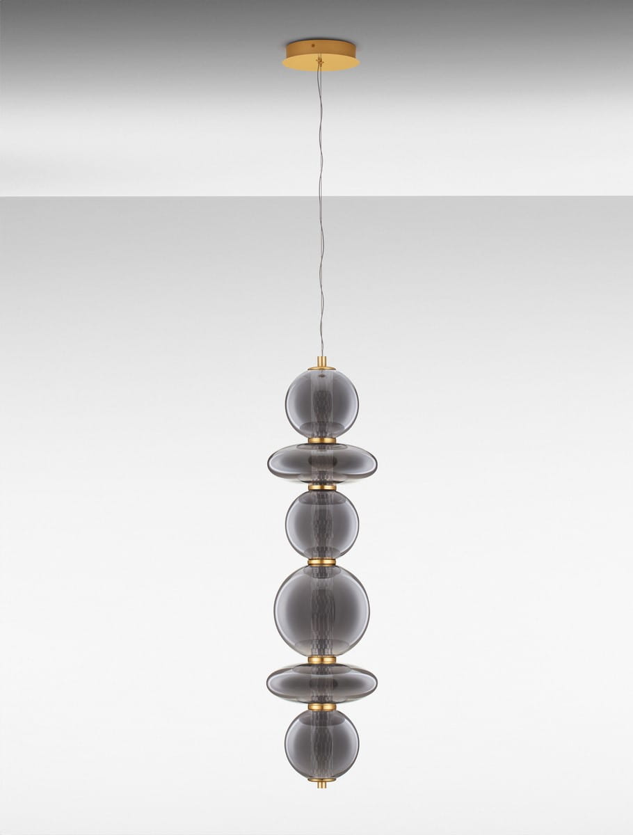 Lampa wisząca Morros to kwintesencja elegancji i współczesnego stylu. Wykonana z dymionego szkła oraz metalu, zachwyca swoim unikatowym designem. Sześć, różnej wielkości szklanych kloszy subtelnie otacza centralny, złocisty rdzeń, tworząc dynamiczną i wielowymiarową kompozycję. Po włączeniu światła lampa odkrywa swój prawdziwy urok – iluminacja podłużnego elementu wewnątrz szkła kreuje niepowtarzalny efekt świetlny, który dodaje wnętrzu przytulności i wyrafinowania.