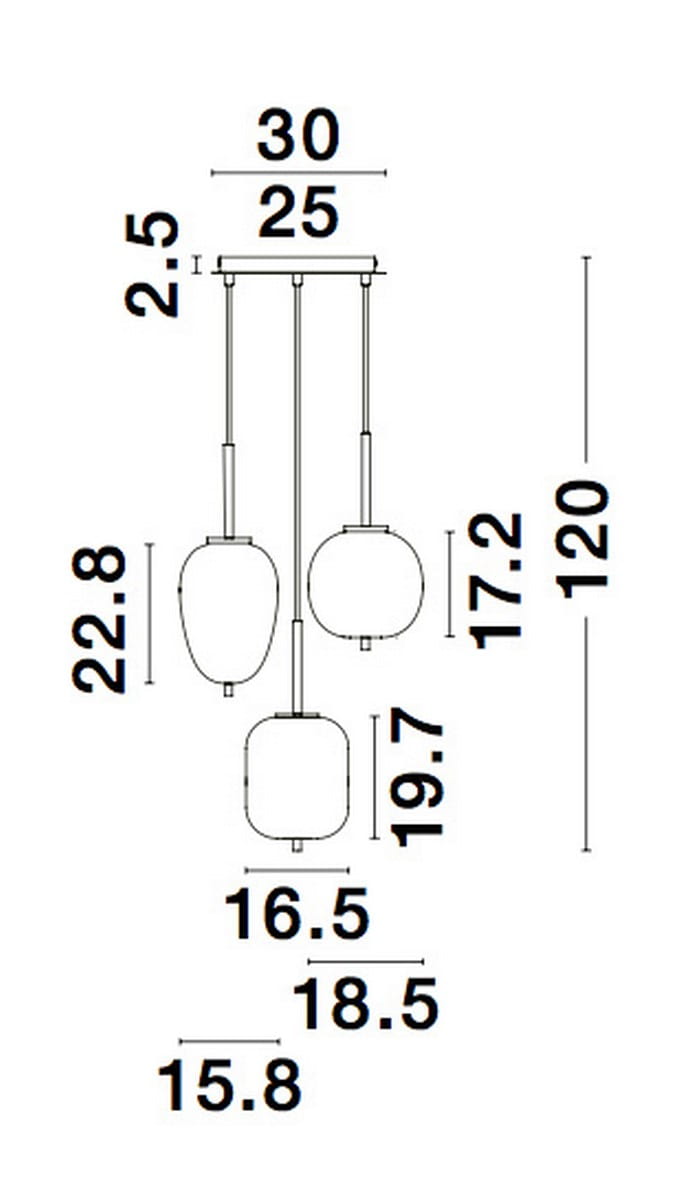 Lampa posiada trzy klosze wykonane z wysokiej jakości szkła w białym kolorze, które przyjemnie rozpraszają światło. Każdy z kloszy zawieszony jest na różnej wysokości oraz posiada inny, kulisty kształt dodając całości dynamicznego i niebanalnego charakteru. Jeśli preferujesz mniejsze oświetlenie z pojedynczym źródłem światła, każdy z unikalnych kształtów kloszy jest dostępny także jako osobna lampa. Możesz wybierać między dwoma rozmiarami: S (mały) i M (średni), co pozwala na dopasowanie wielkości lampy do potrzeb i charakteru Twojej przestrzeni.