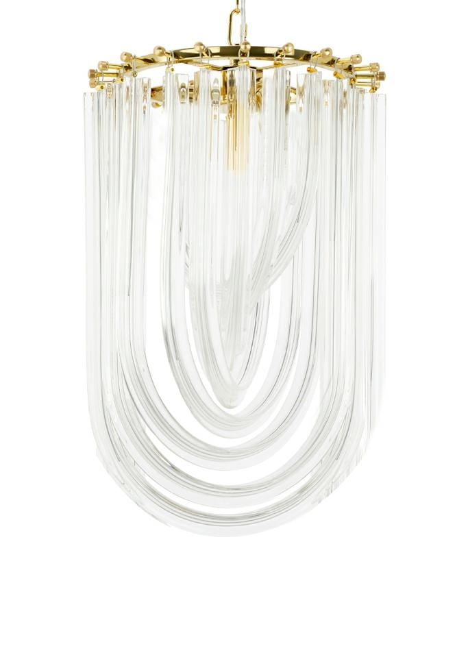 Murano to niezwykła lampa wisząca. Została wykonana z kunsztownie wygiętych szklanych łuków, które doskonale rozpraszają światło. Szklane kryształy oplatają ukryte wewnątrz źródła światła. Każdy z nich zamocowany jest do złotej obręczy, tworząc wyjątkowo elegancką i harmoniczną kompozycję. Całość została umieszczona na złotej podsufitce. Lampa Murano to kwintesencja stylu Glamour.