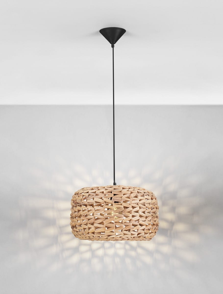 Lampa wisząca Navanta to doskonałe połączenie minimalizmu z naturalną estetyką. Wykonana z ekologicznego hiacynta wodnego oraz trwałej stali, zachwyca prostą, ale efektowną formą. Jej ręcznie pleciony klosz tworzy wyjątkowy wzór, który subtelnie filtruje światło, rzucając na ściany i sufit ciepłe, dekoracyjne refleksy.