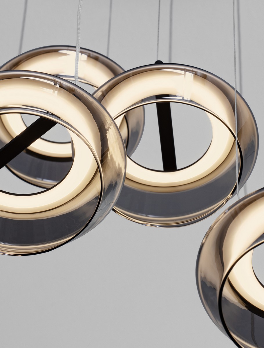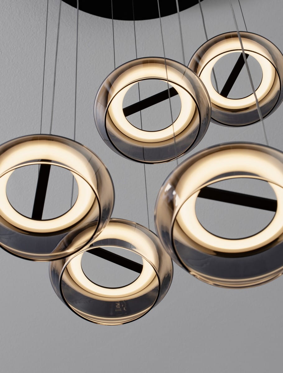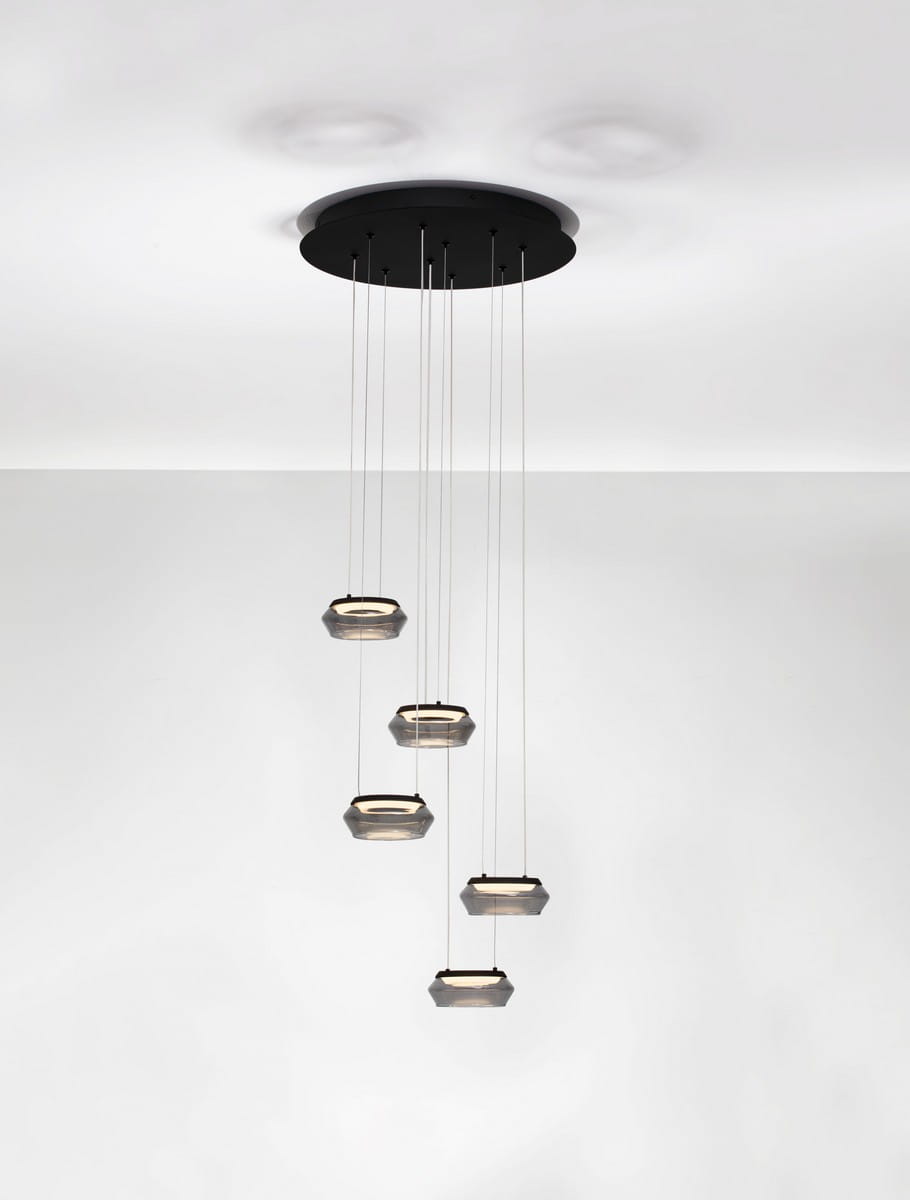 Ovanira Disc-5 to designerska oprawa oświetleniowa, która zachwyca minimalistyczną formą i wyrafinowaną estetyką. Pięć geometrycznych kloszy z dymionego szkła, zawieszone na różnych wysokościach, tworzą harmonijną i efektowną kompozycję, idealnie wpisującą się w nowoczesne wnętrza.