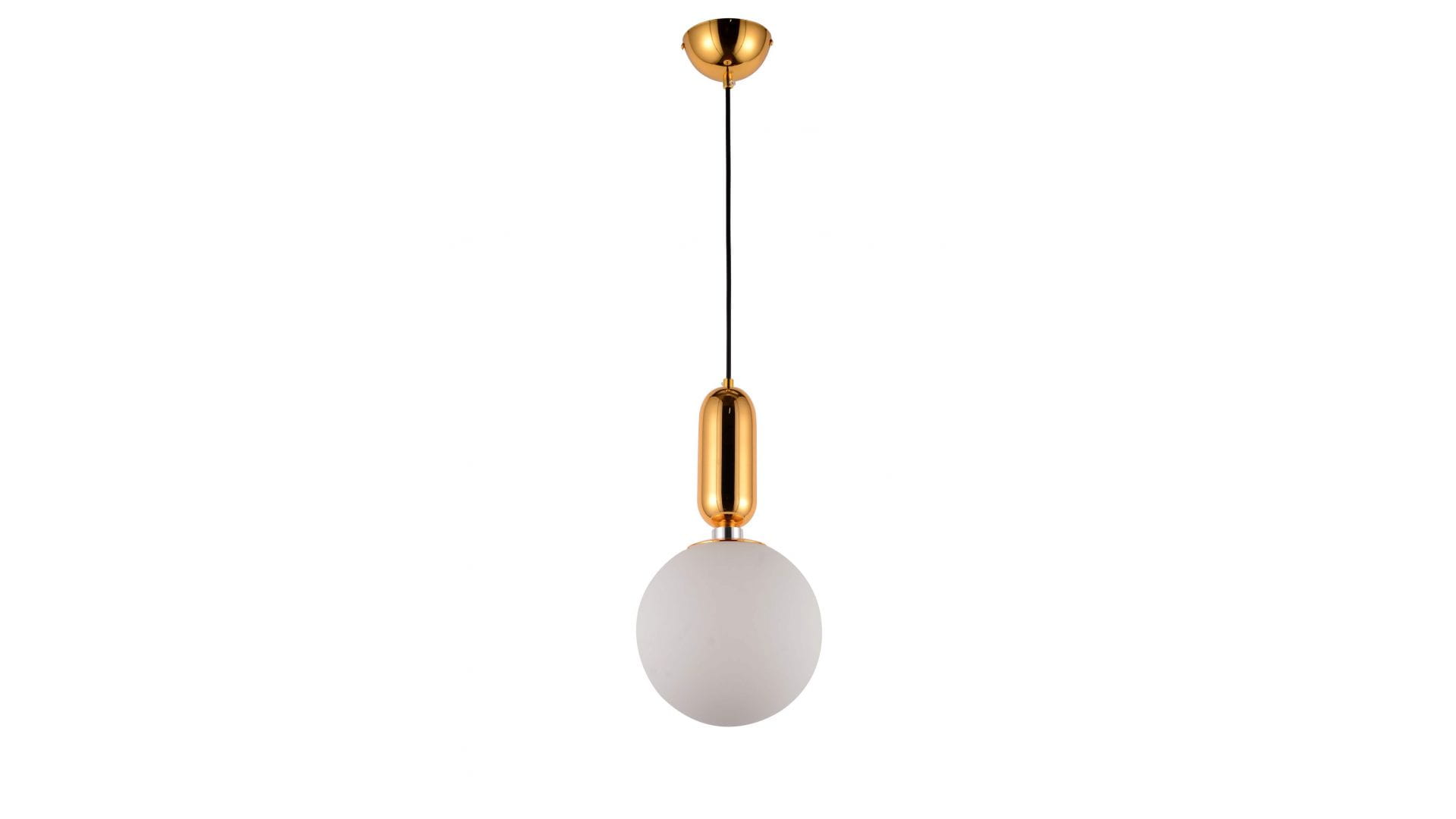 Nowoczesna designerska lampa wykonana z mlecznego, białego szkła. Jej dwukolorowa konstrukcja sprawia, że biała oprawa ze złotym ozdobieniem przekona do siebie każdego. Elegancja objawia się tutaj w najmniejszych szczegółach. Warto zwrócić uwagę na chromowaną obręcz łączącą oba elementy. Całość zamocowano kablem do równie złotej, półokrągłej podsufitki.