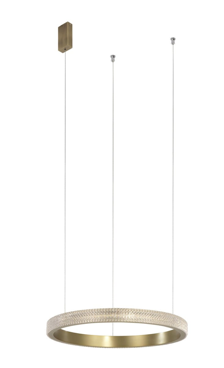 Lampa ma formę ringu wykonanego z aluminium w złotym kolorze o odcieniach antycznego mosiądzu. Jest bogato ozdobiona szeregiem błyszczących kryształków, które pokrywają całą zewnętrzną powierzchnię ringu. Lampa posiada wbudowane źródło światła LED, które odpowiednie rozświetli przestrzeń.