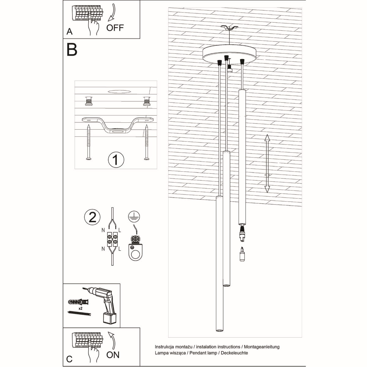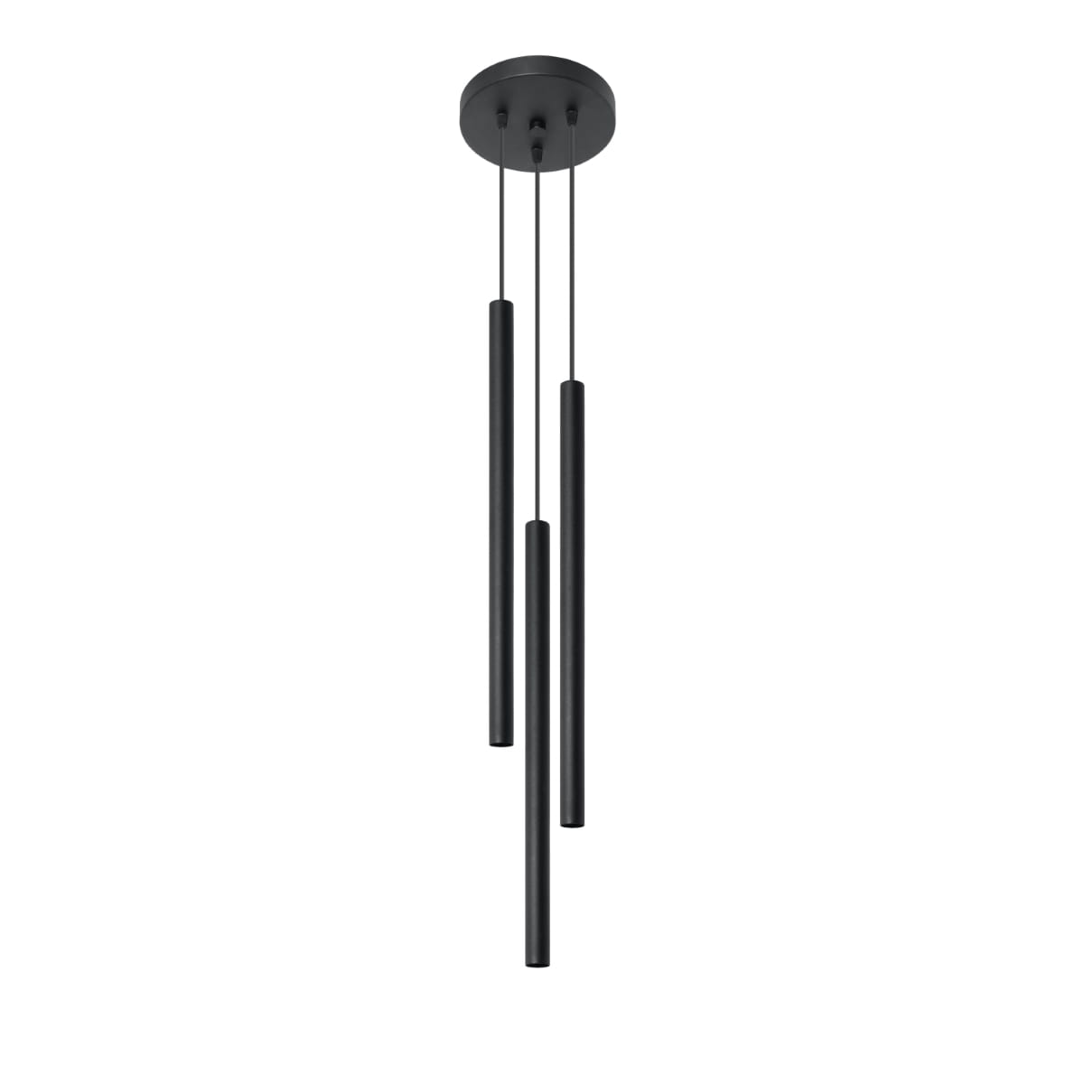 Wykonana ze stali, czarna lampa wisząca posiada trzy smukłe klosze, które zwisają pionowo z okrągłej podsufitki.